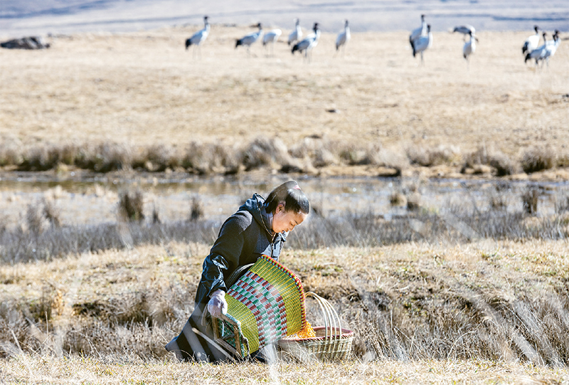近年來,云南大山包黑頸鶴國家級自然保護區(qū)積極實施濕地保護與恢復(fù)、濕地生態(tài)效益補償、食物源基地建設(shè)等管護措施,使這里逐漸成為黑頸鶴在云貴高原上最重要的越冬棲息地和遷徙中轉(zhuǎn)站。圖為2022年12月11日,志愿護鶴員在大山包黑頸鶴國家級自然保護區(qū)準(zhǔn)備給黑頸鶴投食。 新華社記者 曹夢瑤/攝