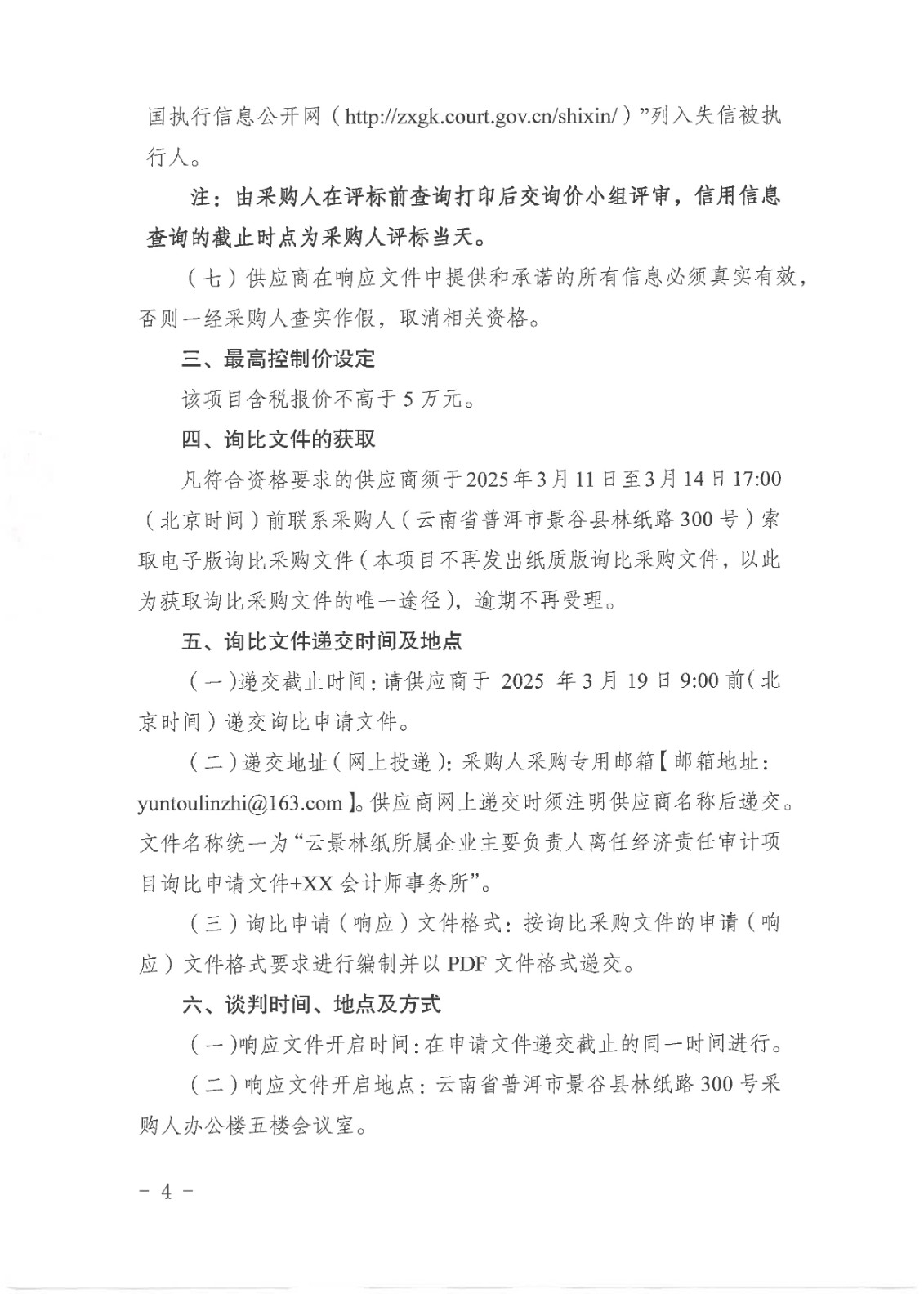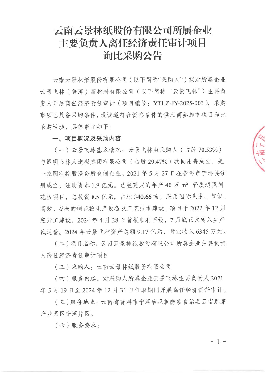 云南云景林紙股份有限公司所屬企業(yè)主要負責人離任經(jīng)濟責任審計項目詢比采購公告