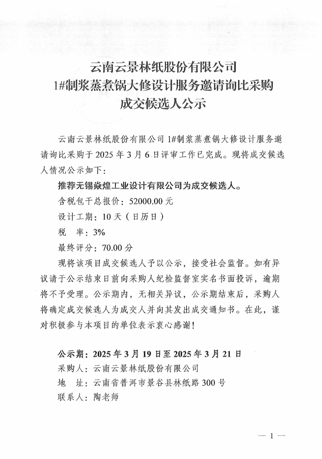 云南云景林紙股份有限公司1#制漿蒸煮鍋大修設(shè)計服務(wù)邀請詢比采購成交候選人公示