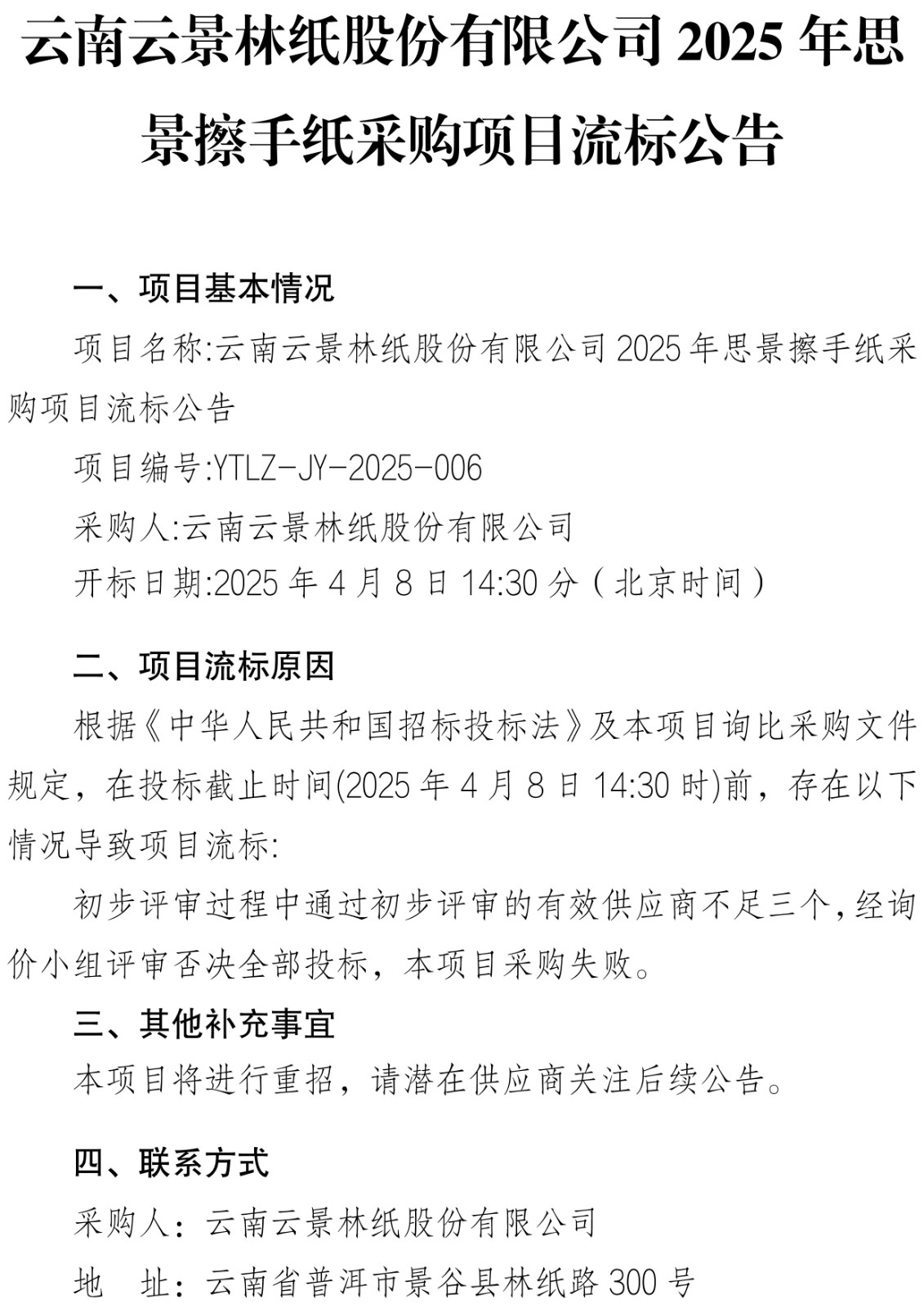 云南云景林紙股份有限公司2025年思景擦手紙采購項(xiàng)目流標(biāo)公告