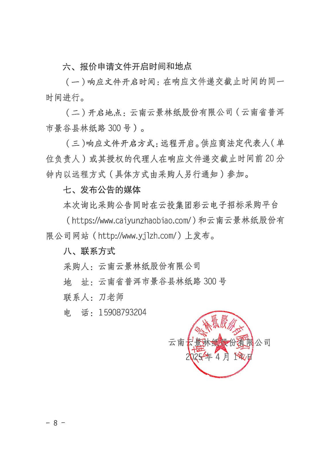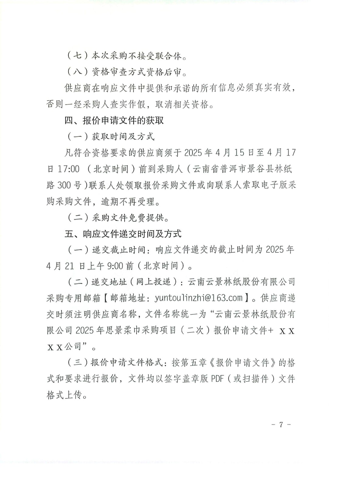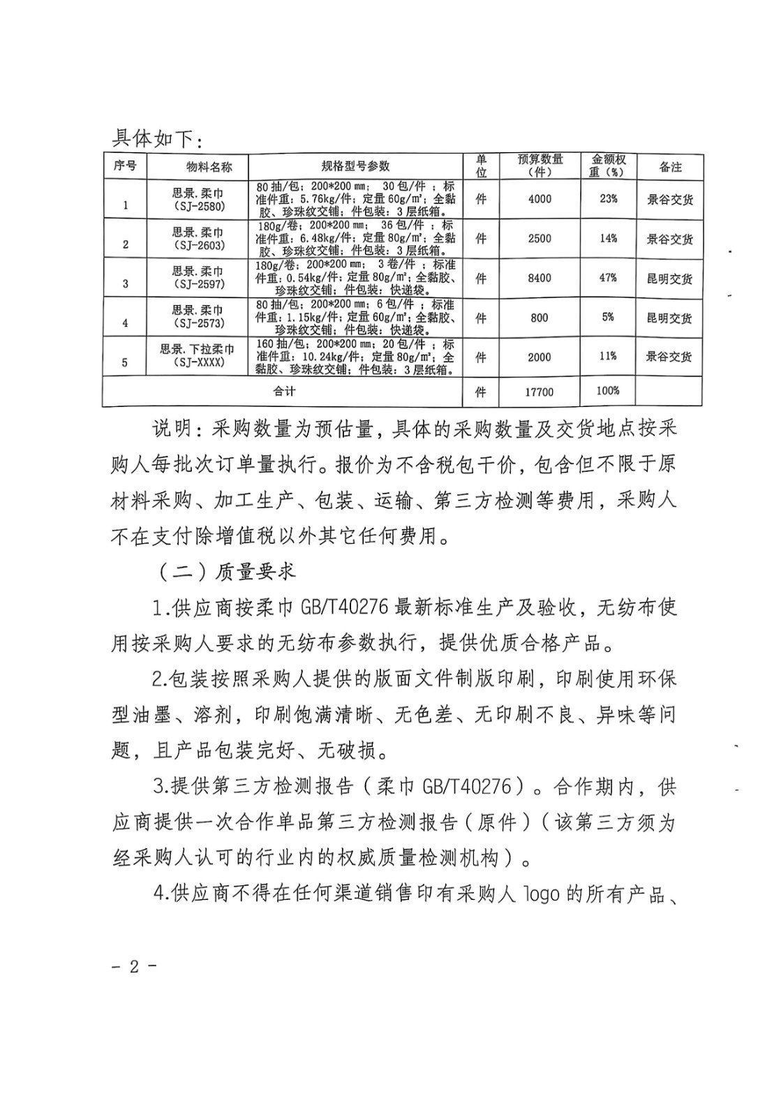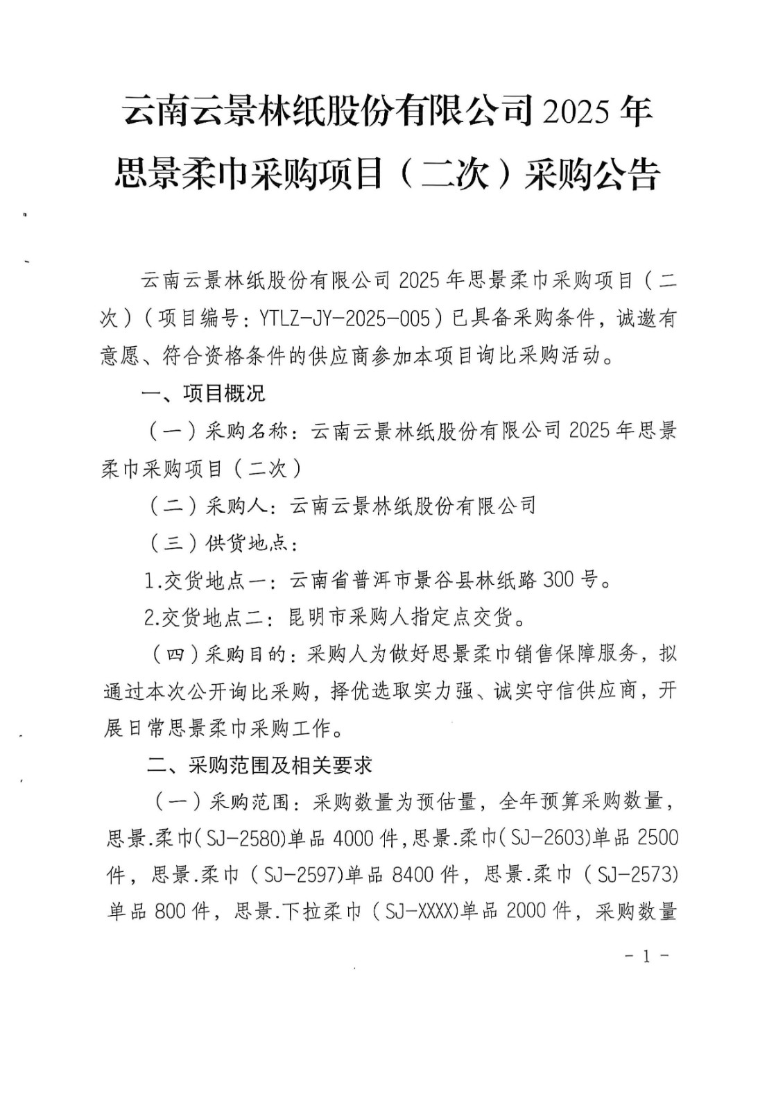 云南云景林紙股份有限公司2025年思景柔巾采購(gòu)項(xiàng)目(二次)采購(gòu)公告