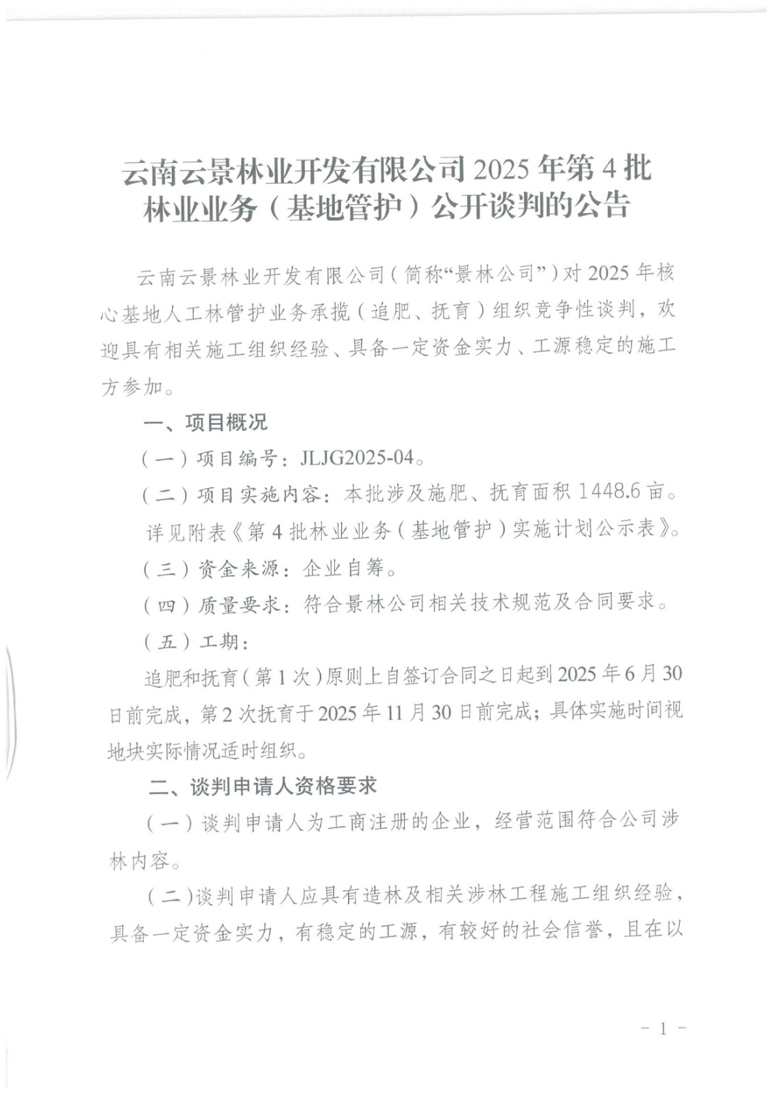 云南云景林業(yè)開(kāi)發(fā)有限公司2025年第4批林業(yè)業(yè)務(wù)(基地管護(hù))公開(kāi)談判的公告