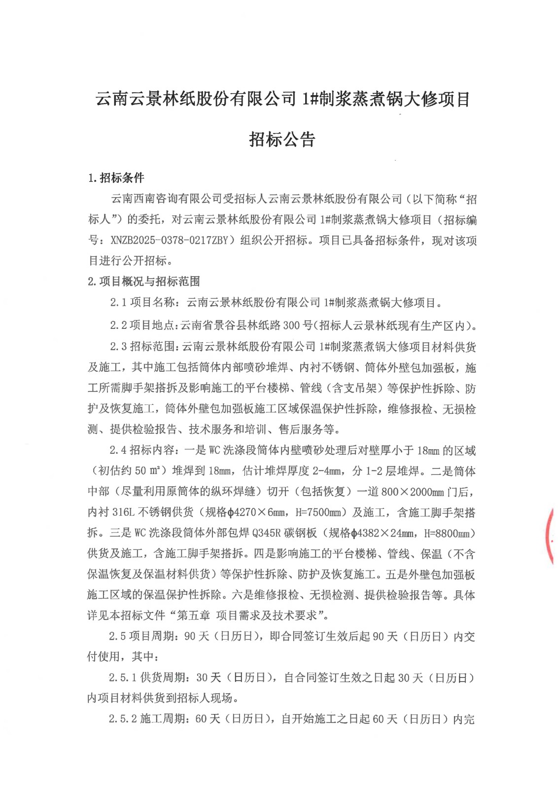 云南云景林紙股份有限公司1#制漿蒸煮鍋大修項目招標(biāo)公告
