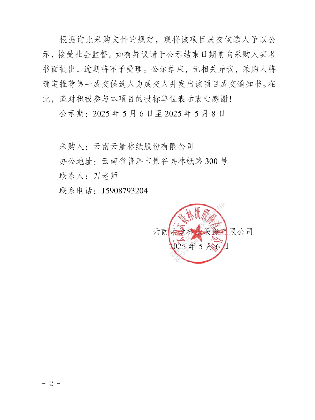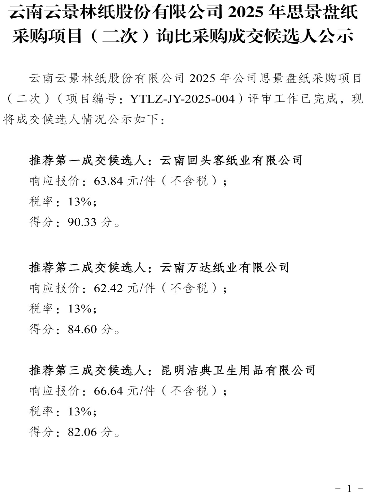 云南云景林紙股份有限公司2025年思景盤紙采購項(xiàng)目(二次)詢比采購成交候選人公示