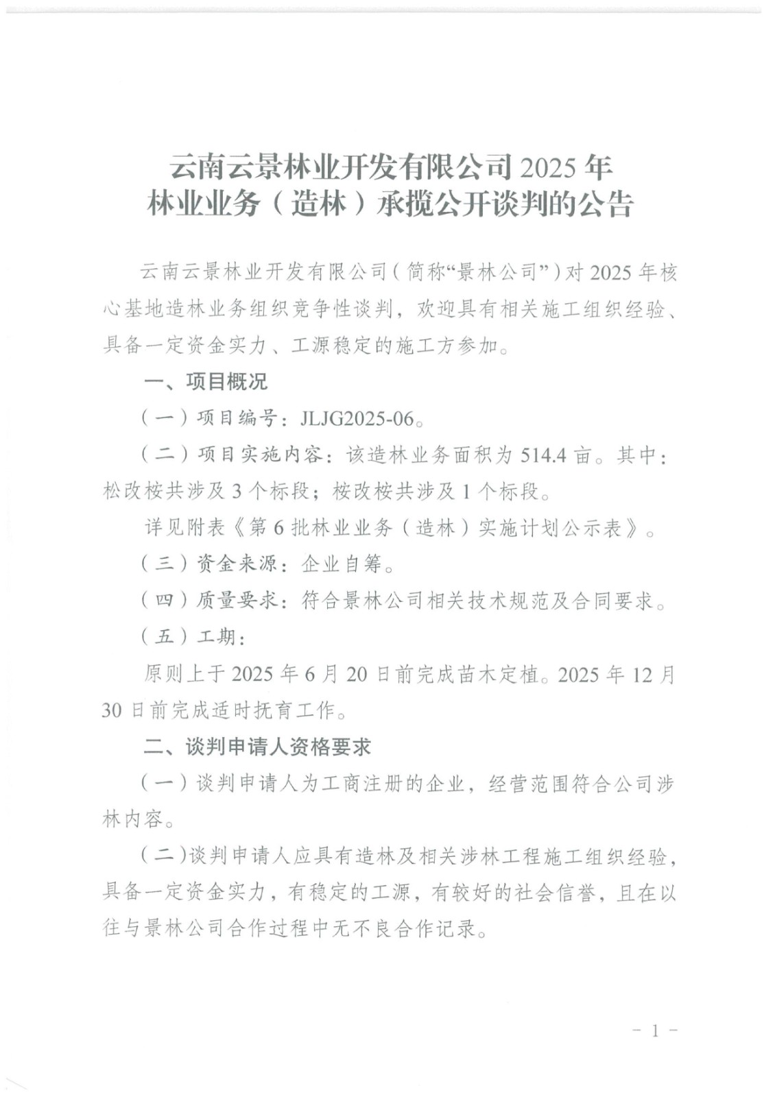 云南云景林業(yè)開發(fā)有限公司2025年林業(yè)業(yè)務(wù)(造林)承攬公開談判的公告