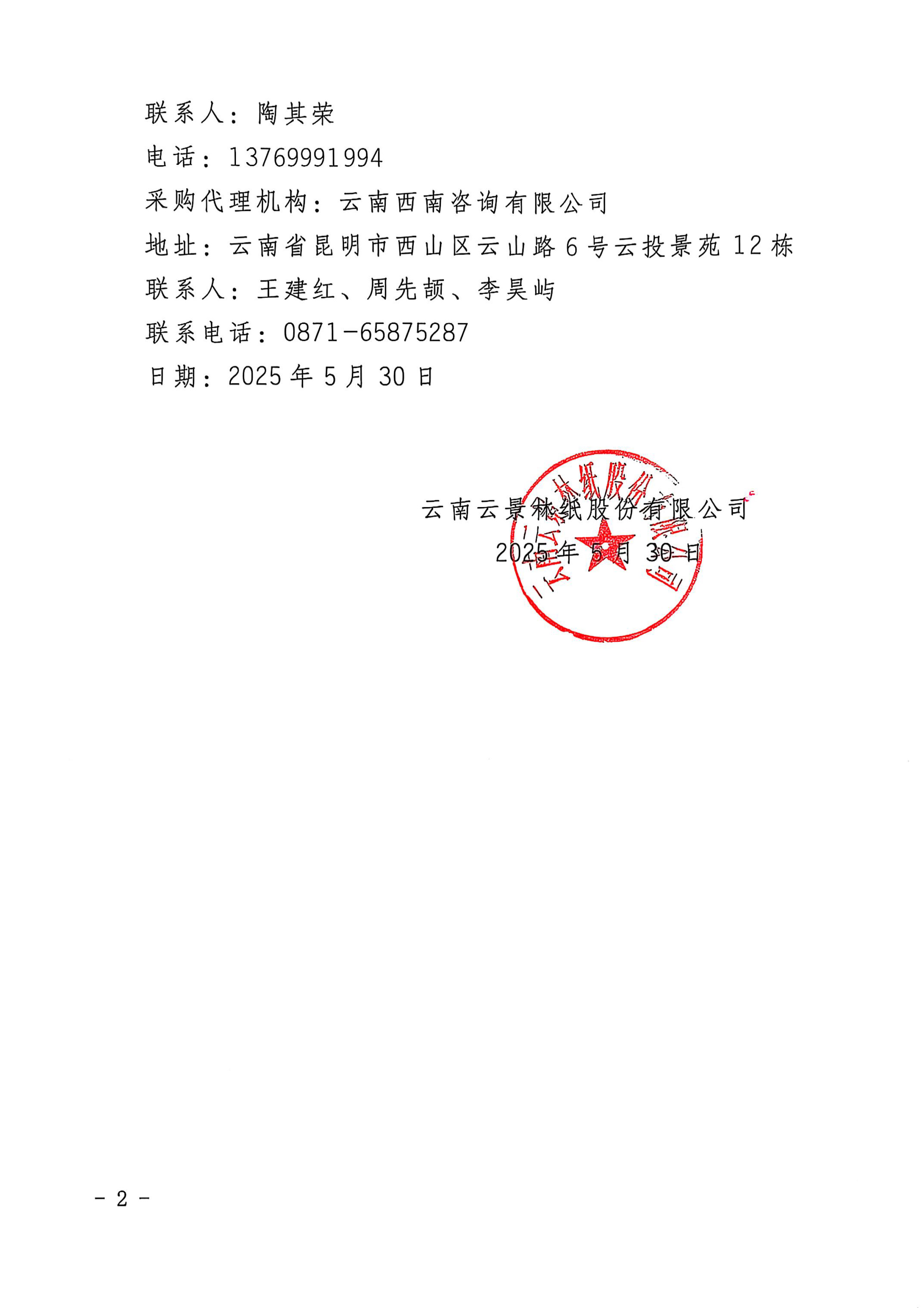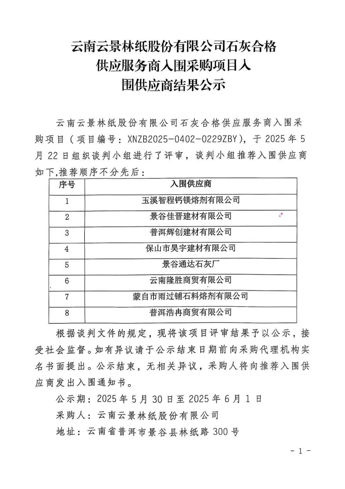 云南云景林紙股份有限公司石灰合格供應服務商人圍采購項目入圍供應商結果公示