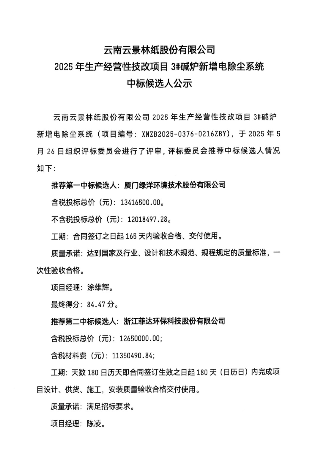 云南云景林紙股份有限公司2025年生產(chǎn)經(jīng)營性技改項目3#堿爐新增電除塵系統(tǒng)中標候選人公示