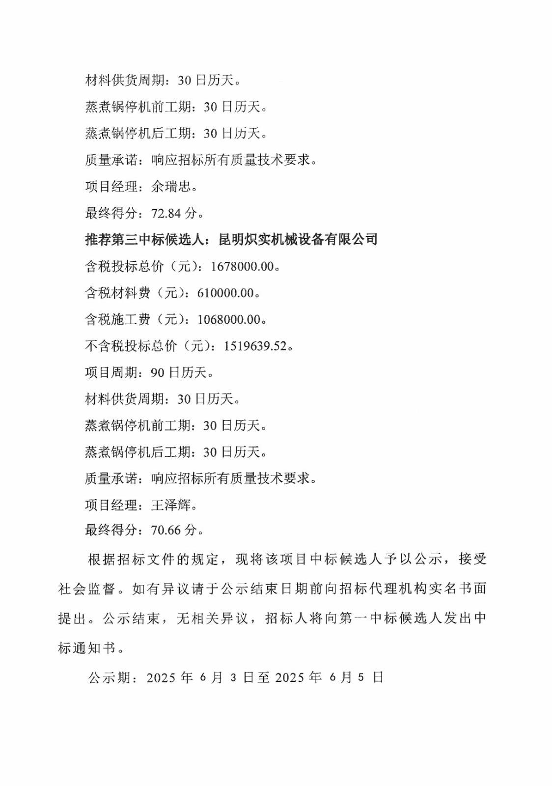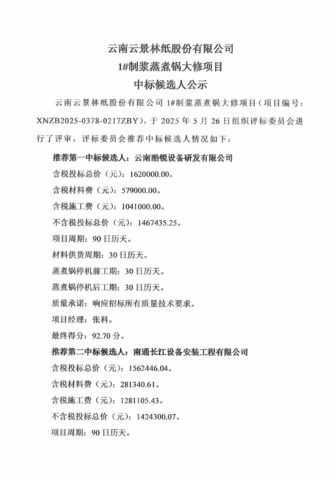 云南云景林紙股份有限公司1#制漿蒸煮鍋大修項目中標(biāo)候選人公示