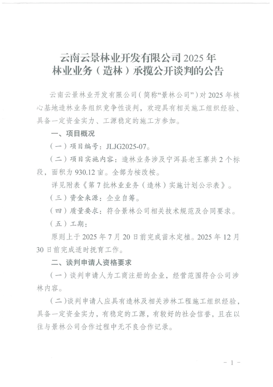 云南云景林業(yè)開發(fā)有限公司2025年林業(yè)業(yè)務(wù)(造林)承攬公開談判的公告