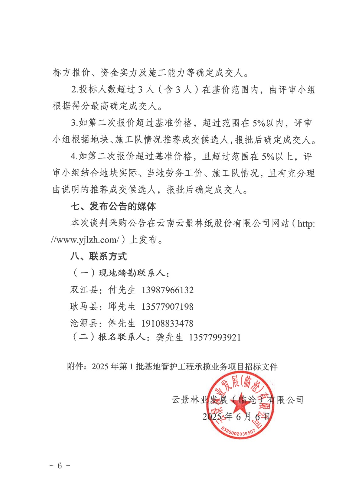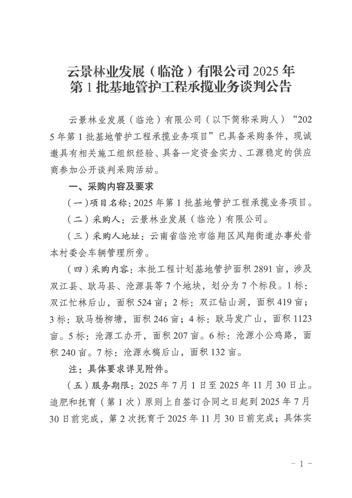 云景林業(yè)發(fā)展(臨滄)有限公司2025年第1批基地管護工程承攬業(yè)務(wù)談判公告