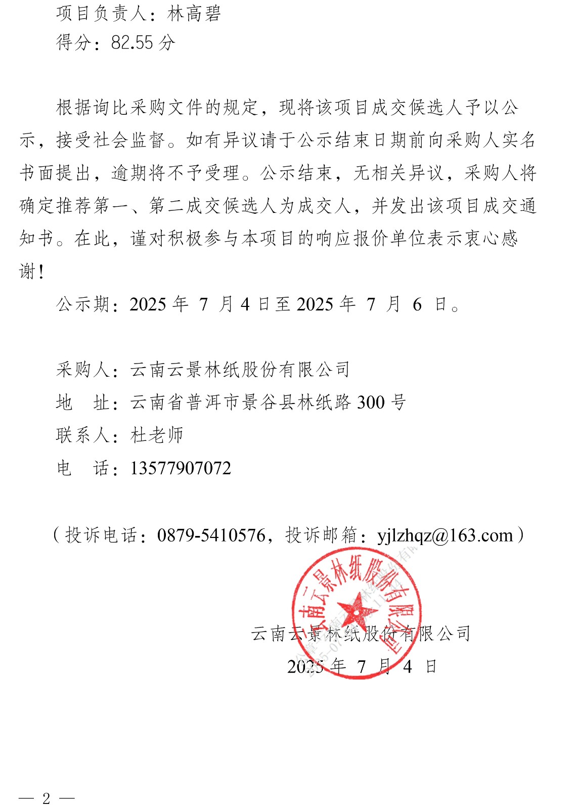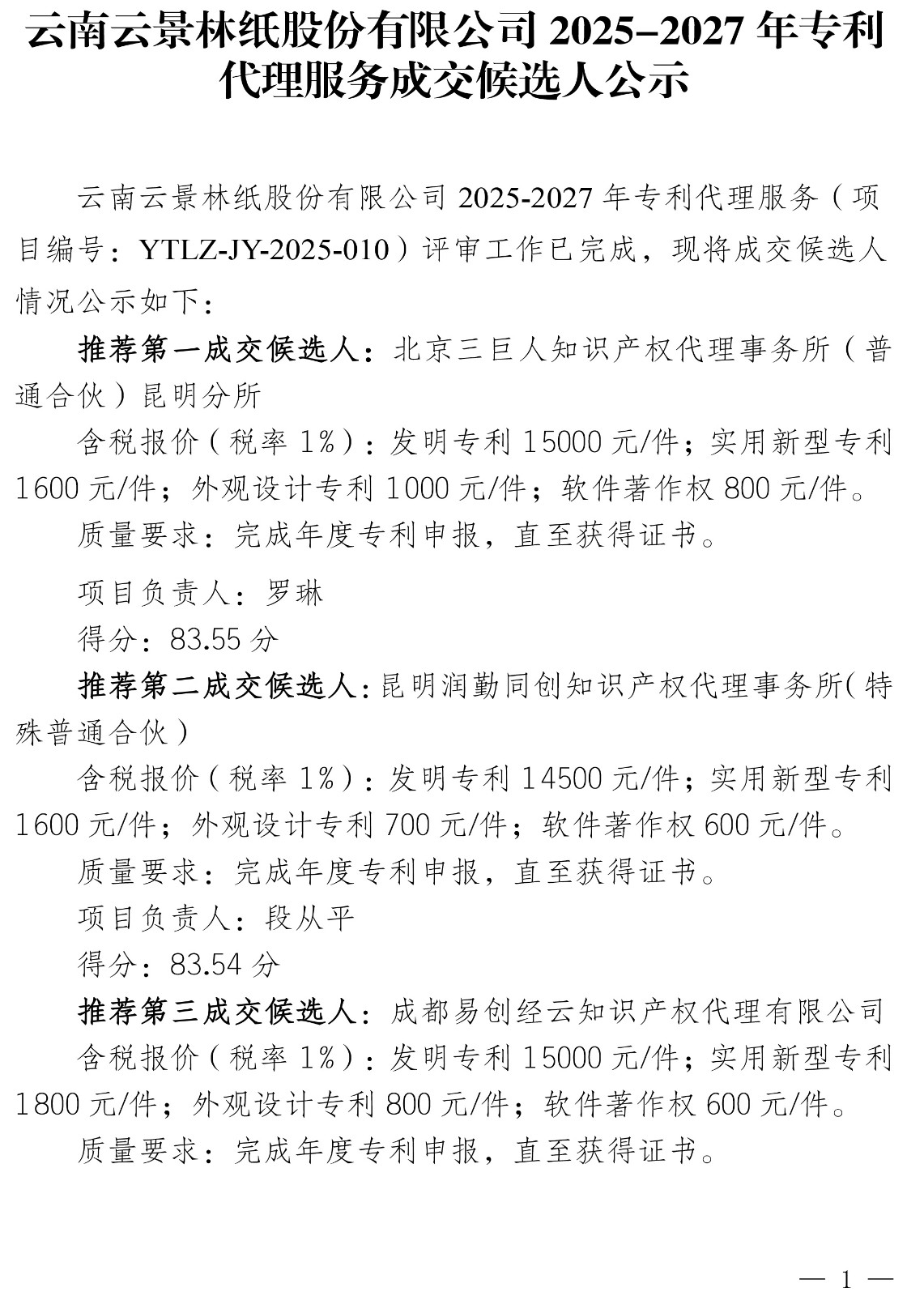 云南云景林紙股份有限公司2025-2027年專利代理服務(wù)成交候選人公示