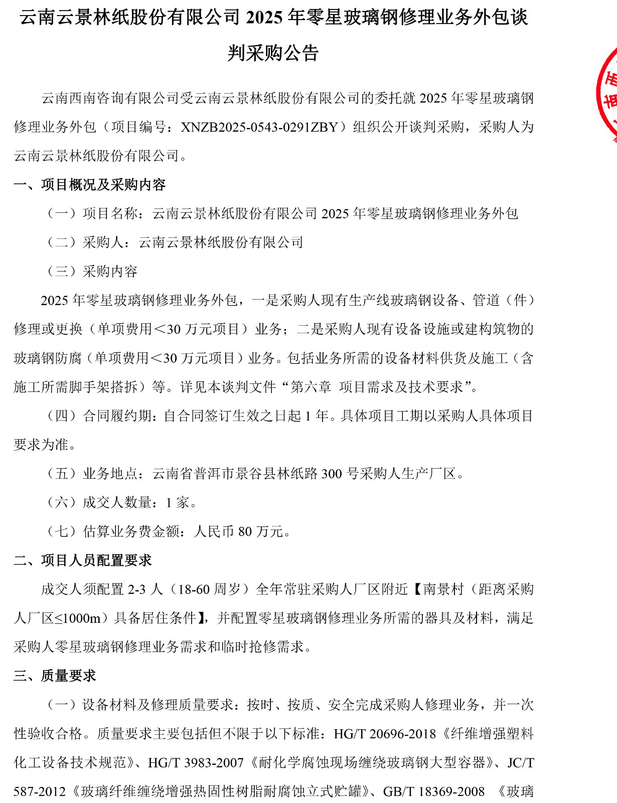 云南云景林紙股份有限公司2025年零星玻璃鋼修理業(yè)務(wù)外包談判采購(gòu)公告