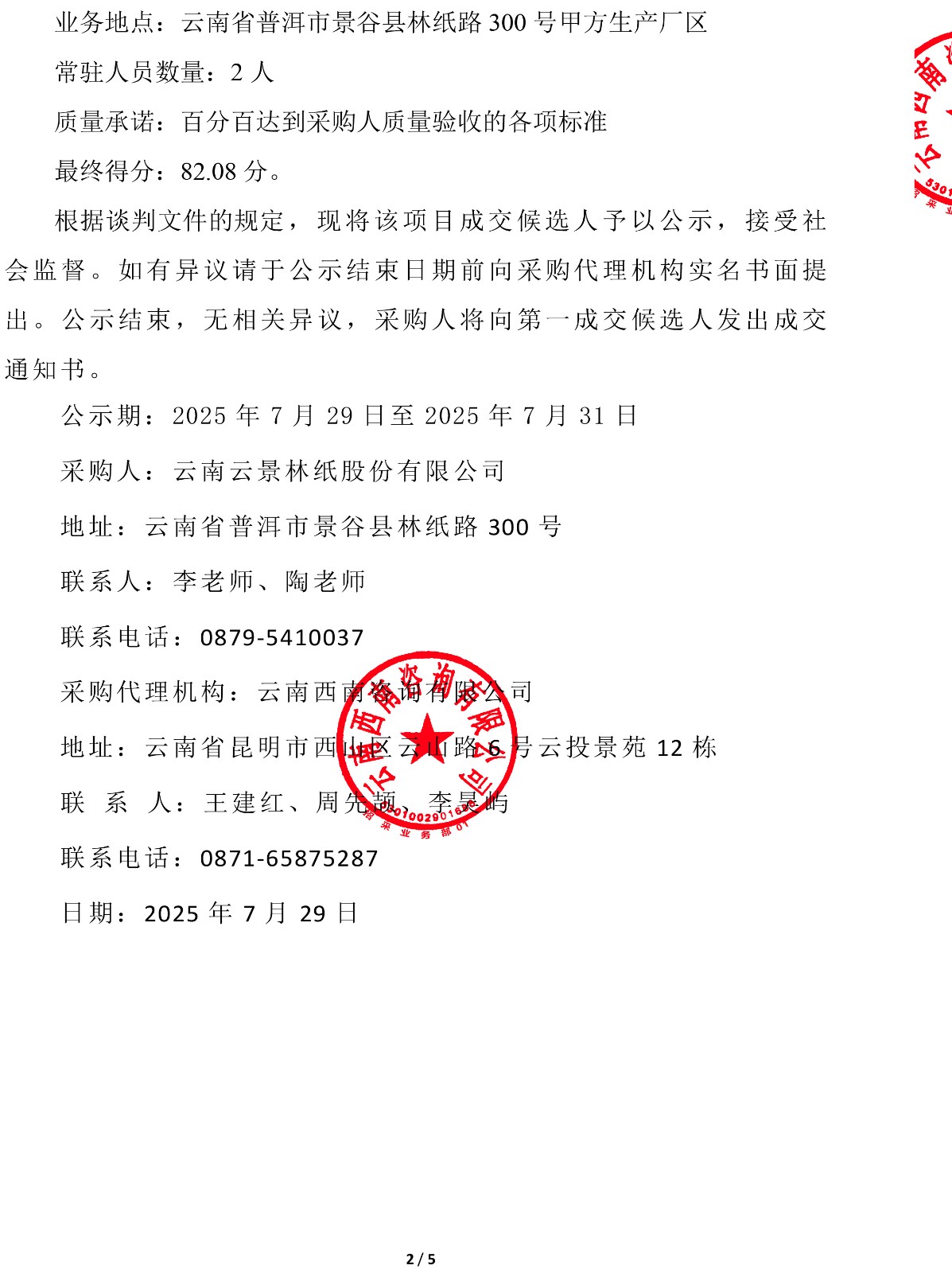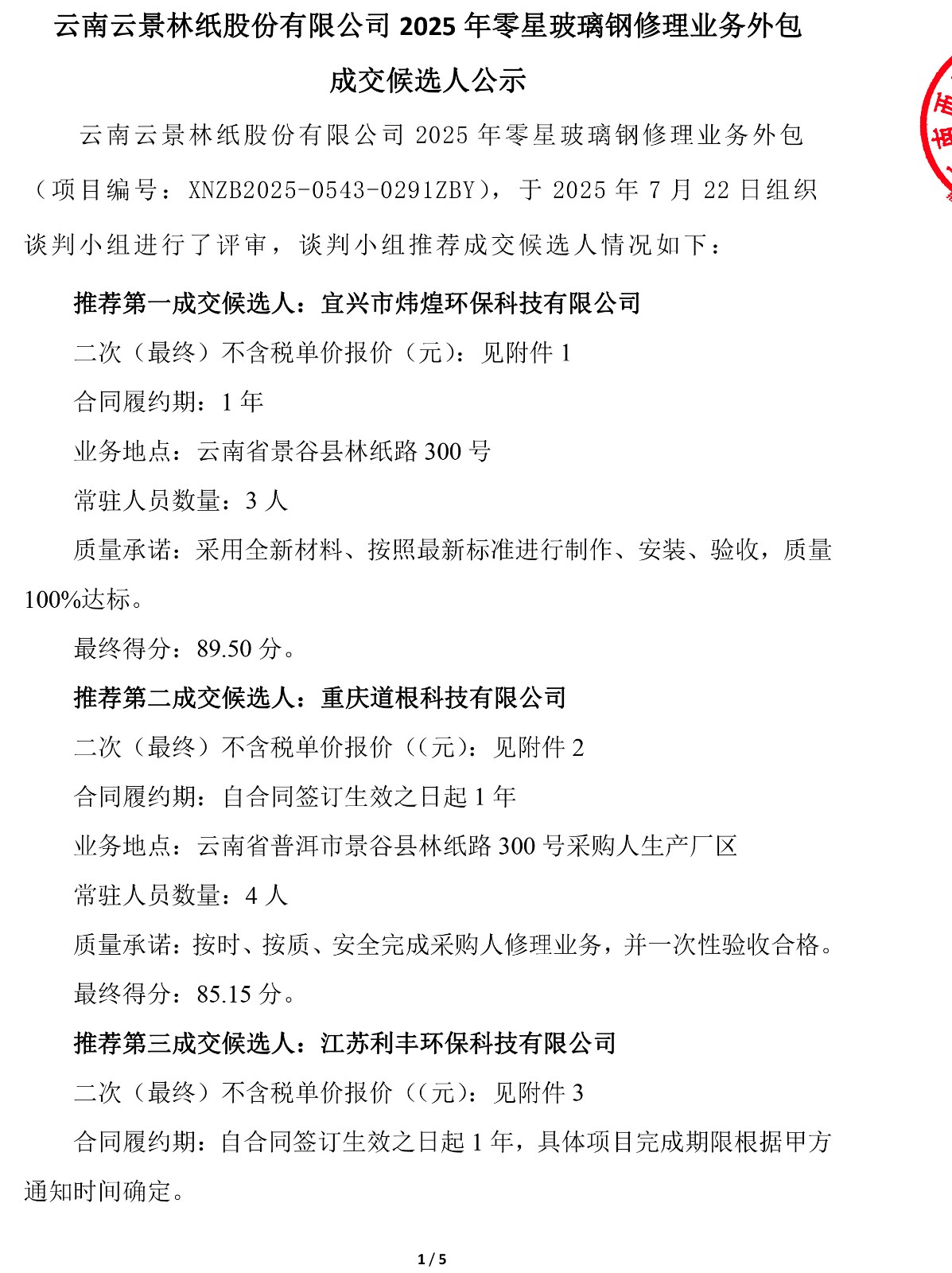 云南云景林紙股份有限公司2025年零星玻璃鋼修理業(yè)務(wù)外包成交候選人公示