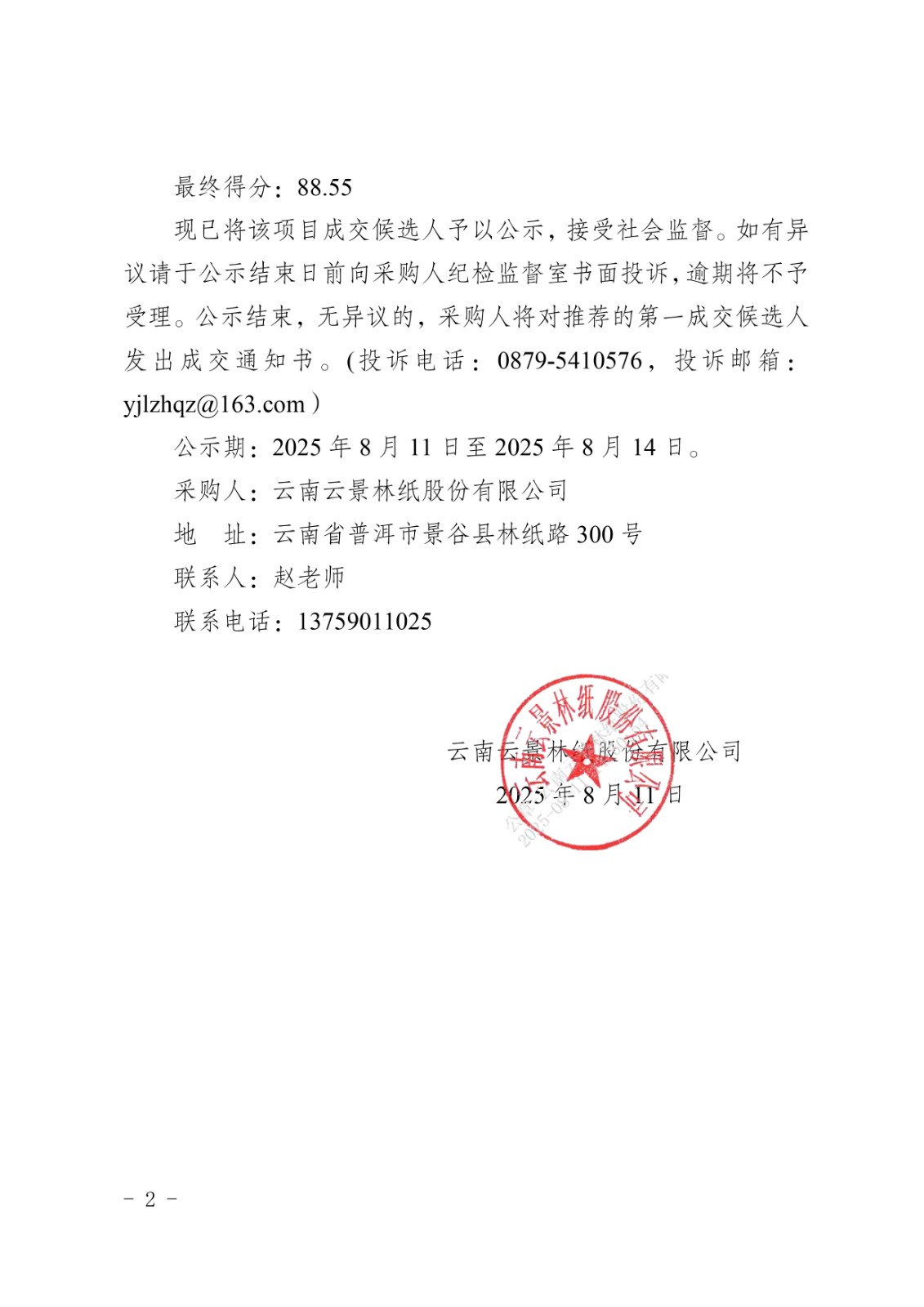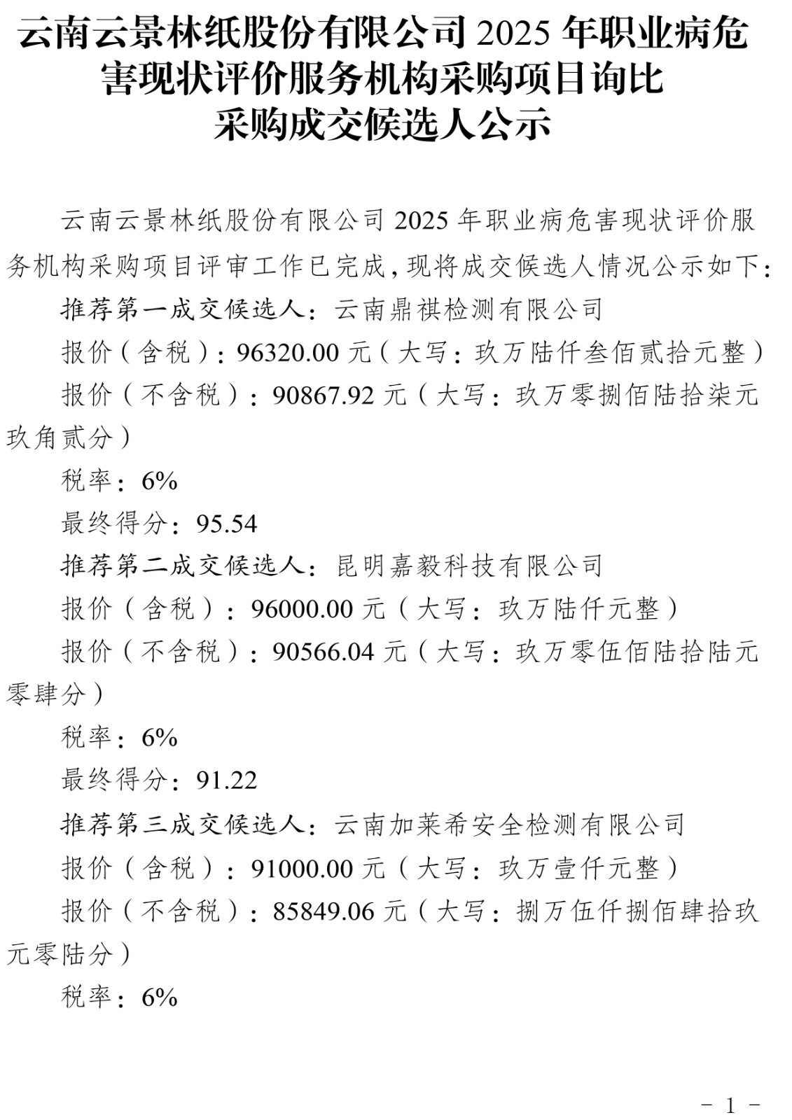 云南云景林紙股份有限公司2025年職業(yè)病危害現(xiàn)狀評價服務(wù)機構(gòu)采購項目詢比采購成交候選人公示