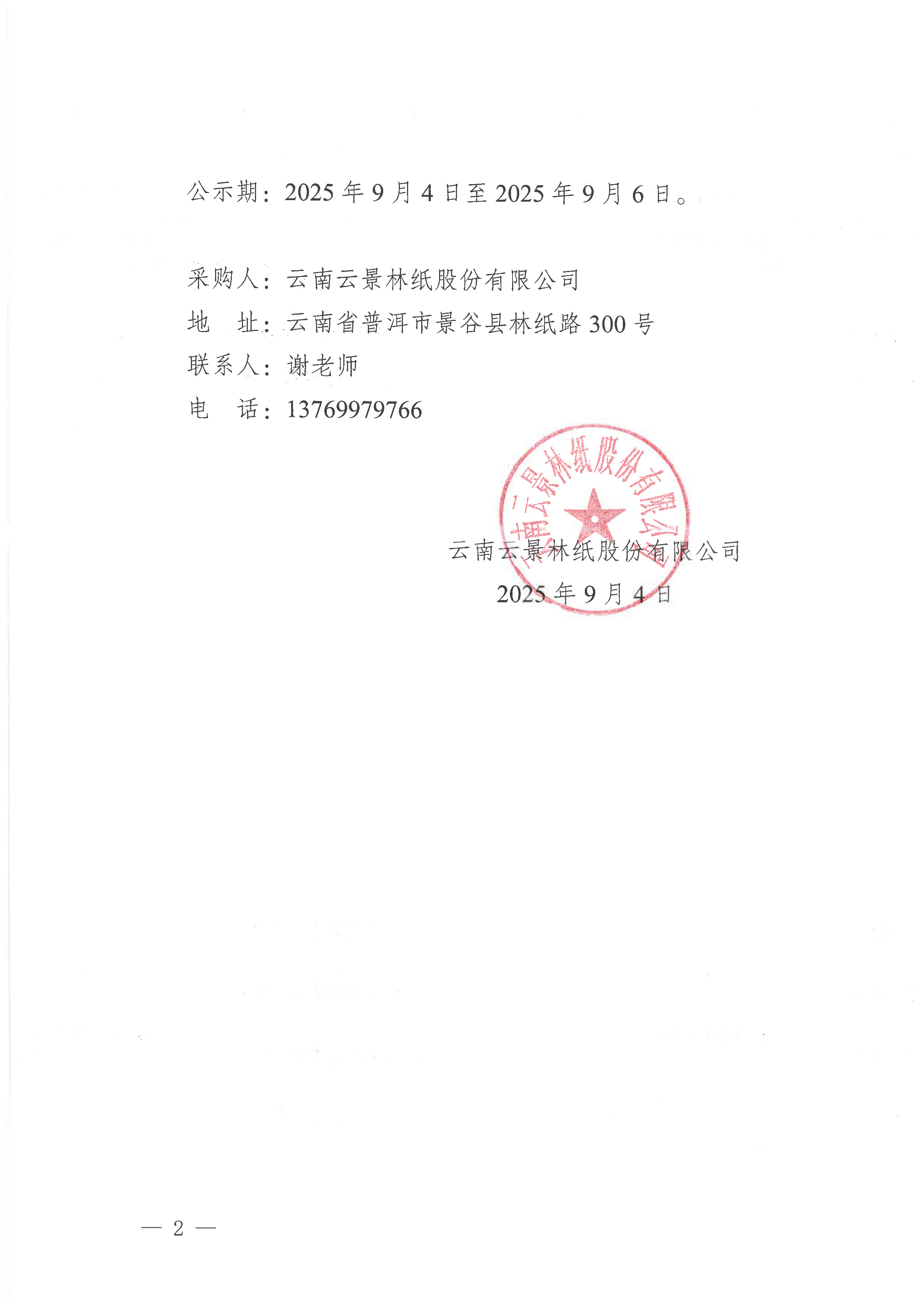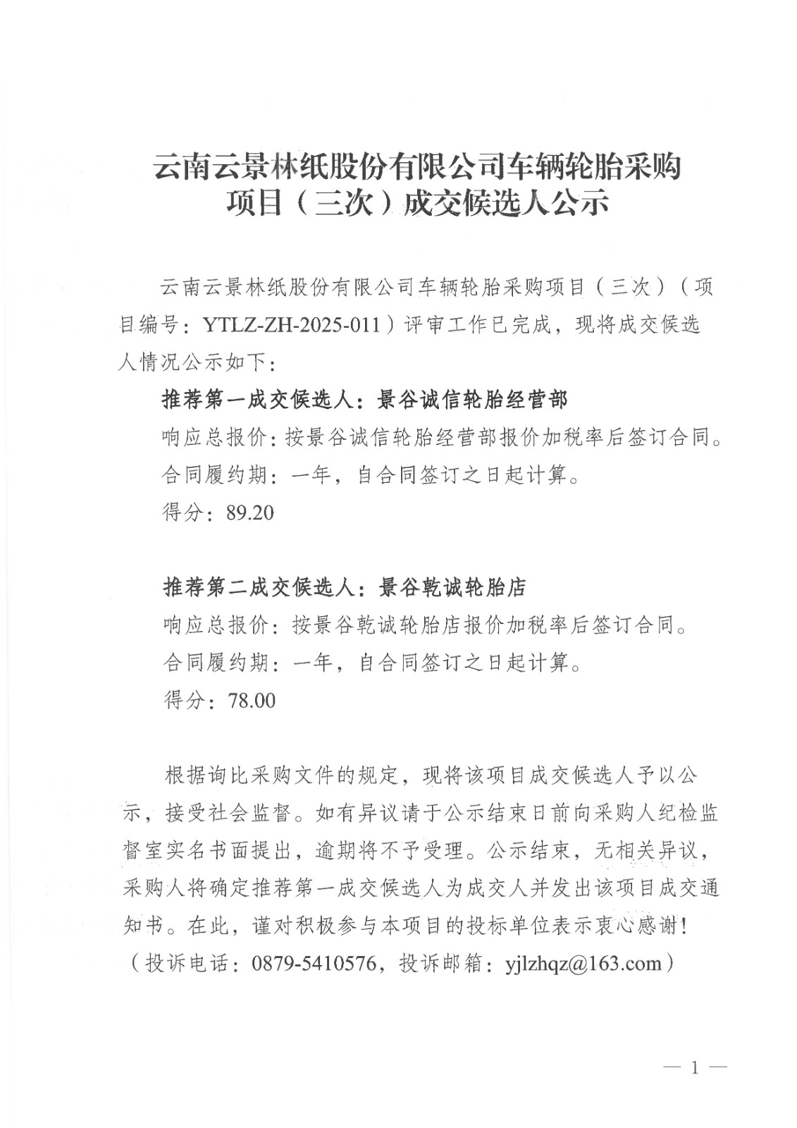 云南云景林紙股份有限公司車輛輪胎采購項目(三次)成交候選人公示