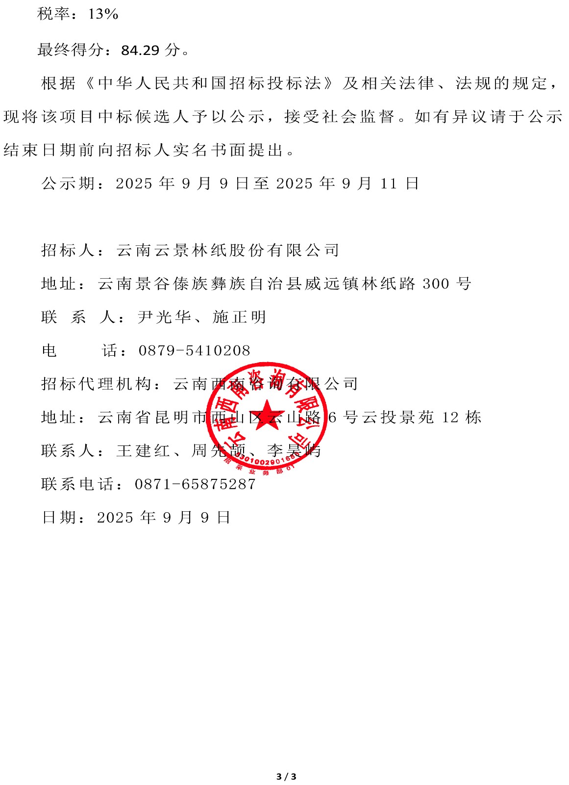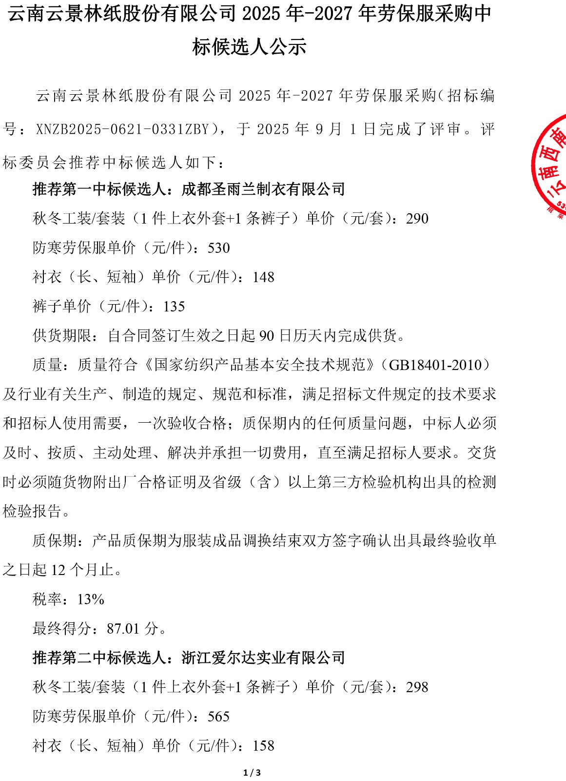 云南云景林紙股份有限公司2025年-2027年勞保服采購中標候選人公示