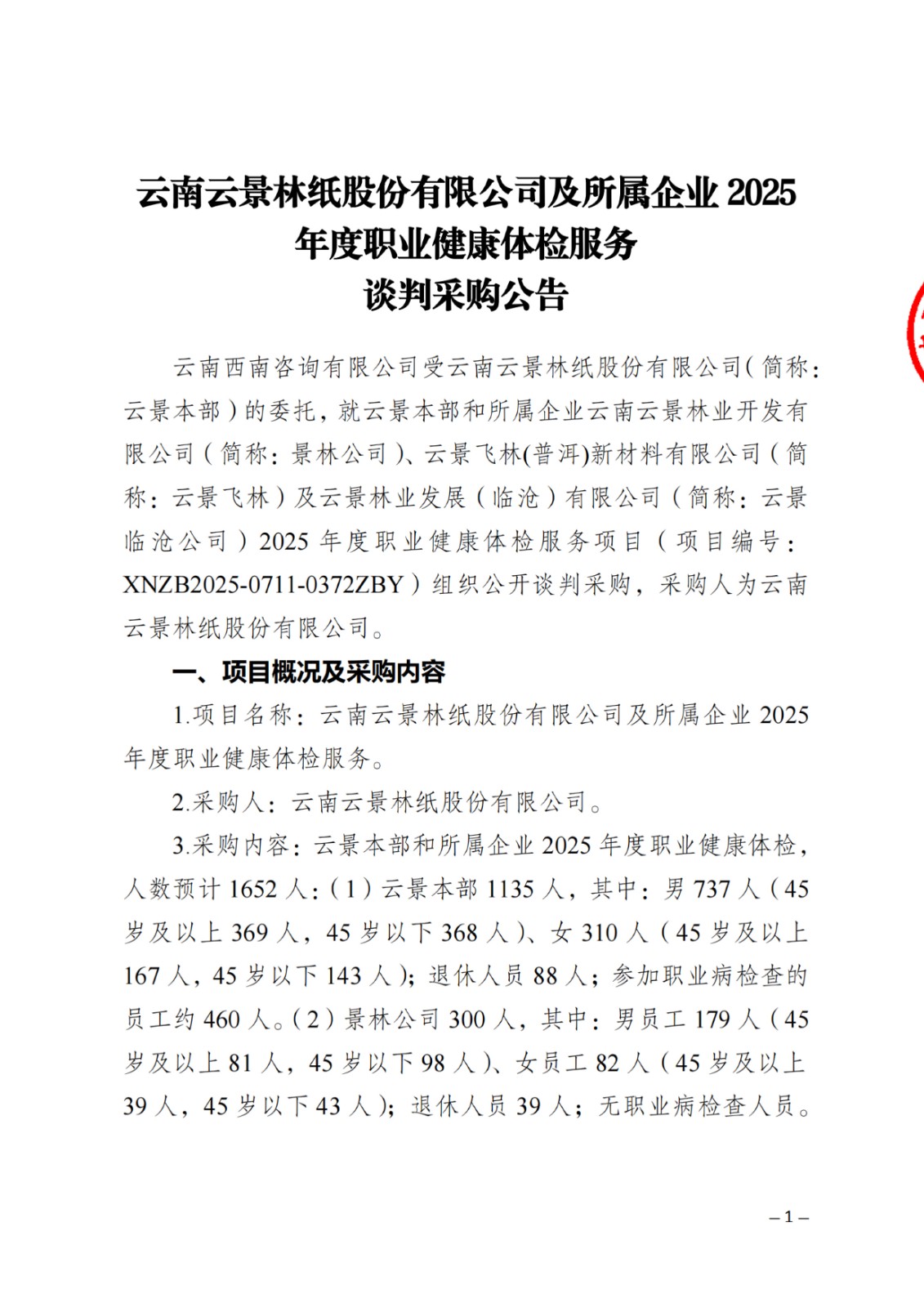 云南云景林紙股份有限公司及所屬企業(yè)2025年度職業(yè)健康體檢服務(wù)談判采購公告
