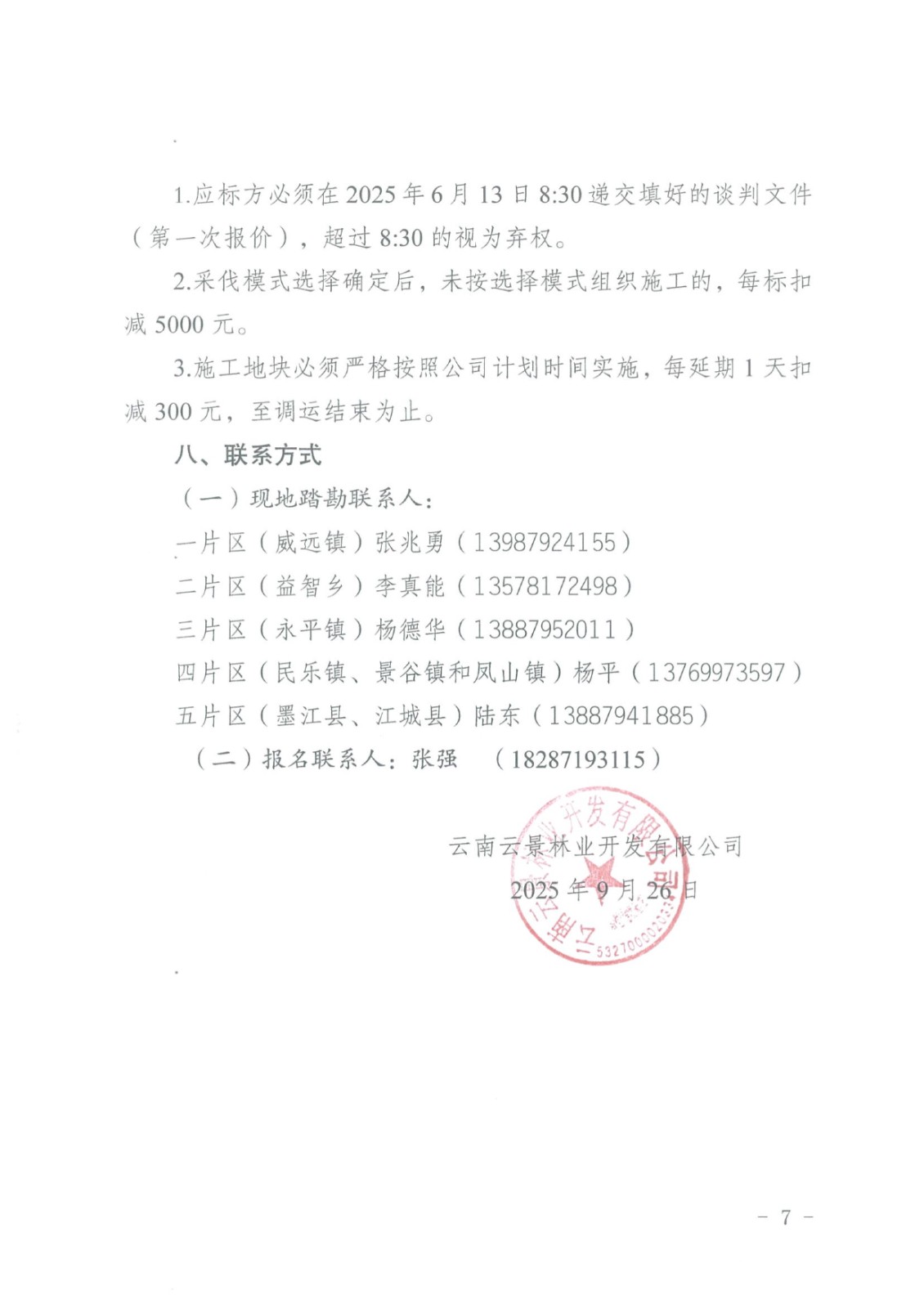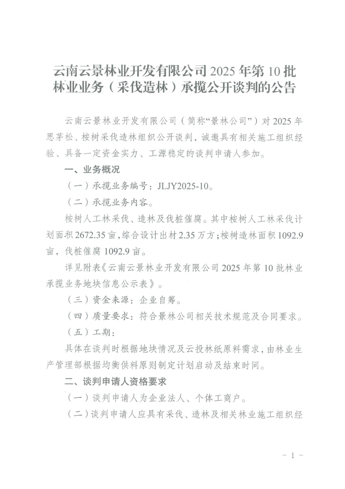 云南云景林業(yè)開發(fā)有限公司2025年第10批林業(yè)業(yè)務(wù)(采伐造林)承攬公開談判的公告