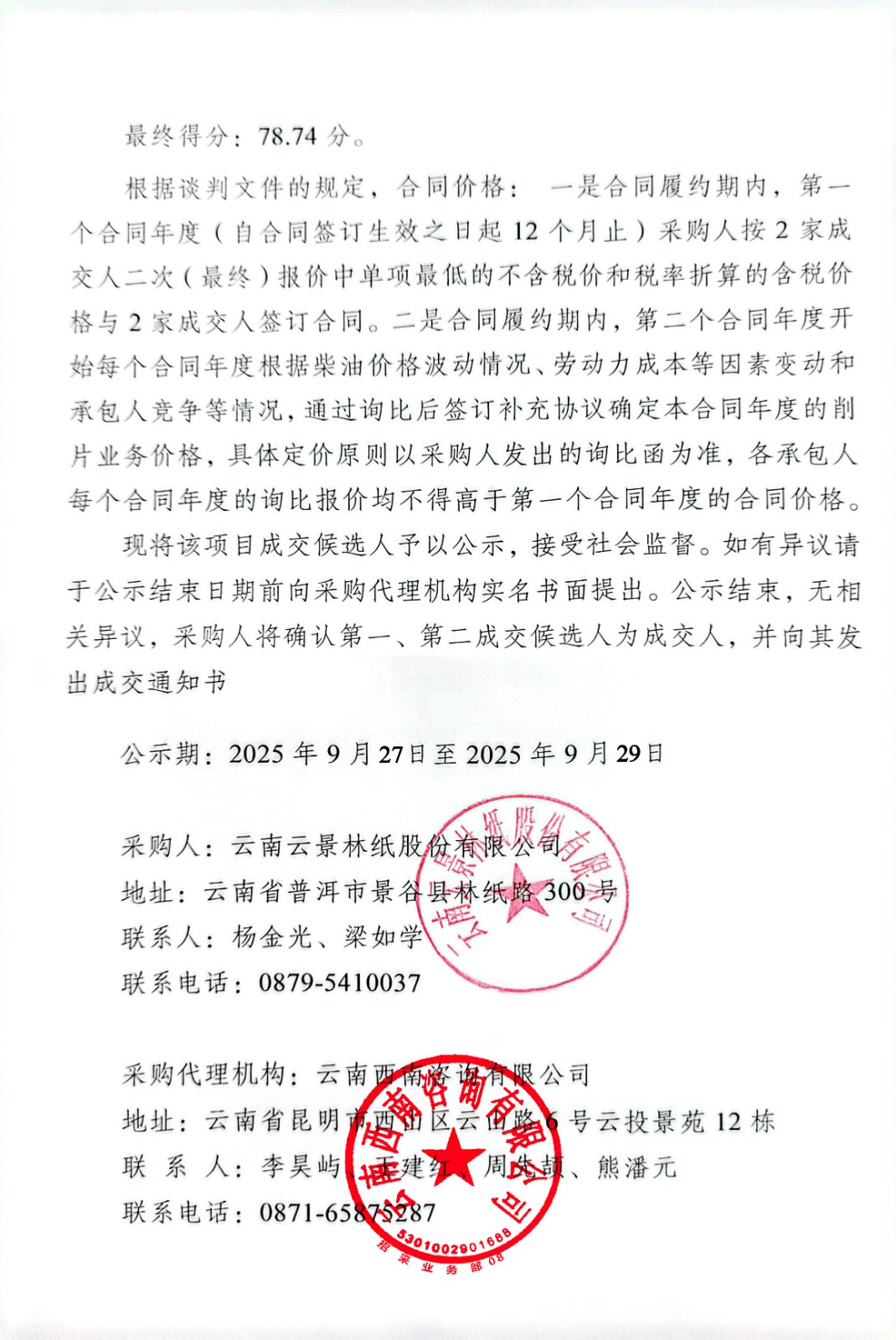 云南云景林紙股份有限公司2025-2029年木削片倒運業(yè)務(wù)外包成交候選人公示