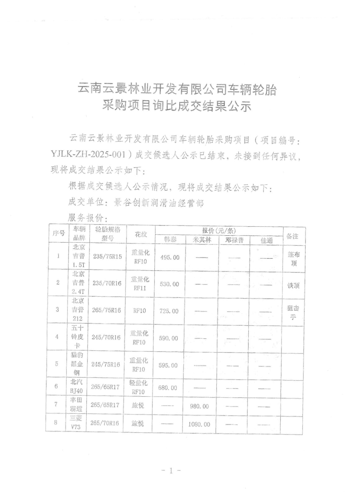云南云景林業(yè)開發(fā)有限公司車輛輪胎采購項目詢比成交結(jié)果公示
