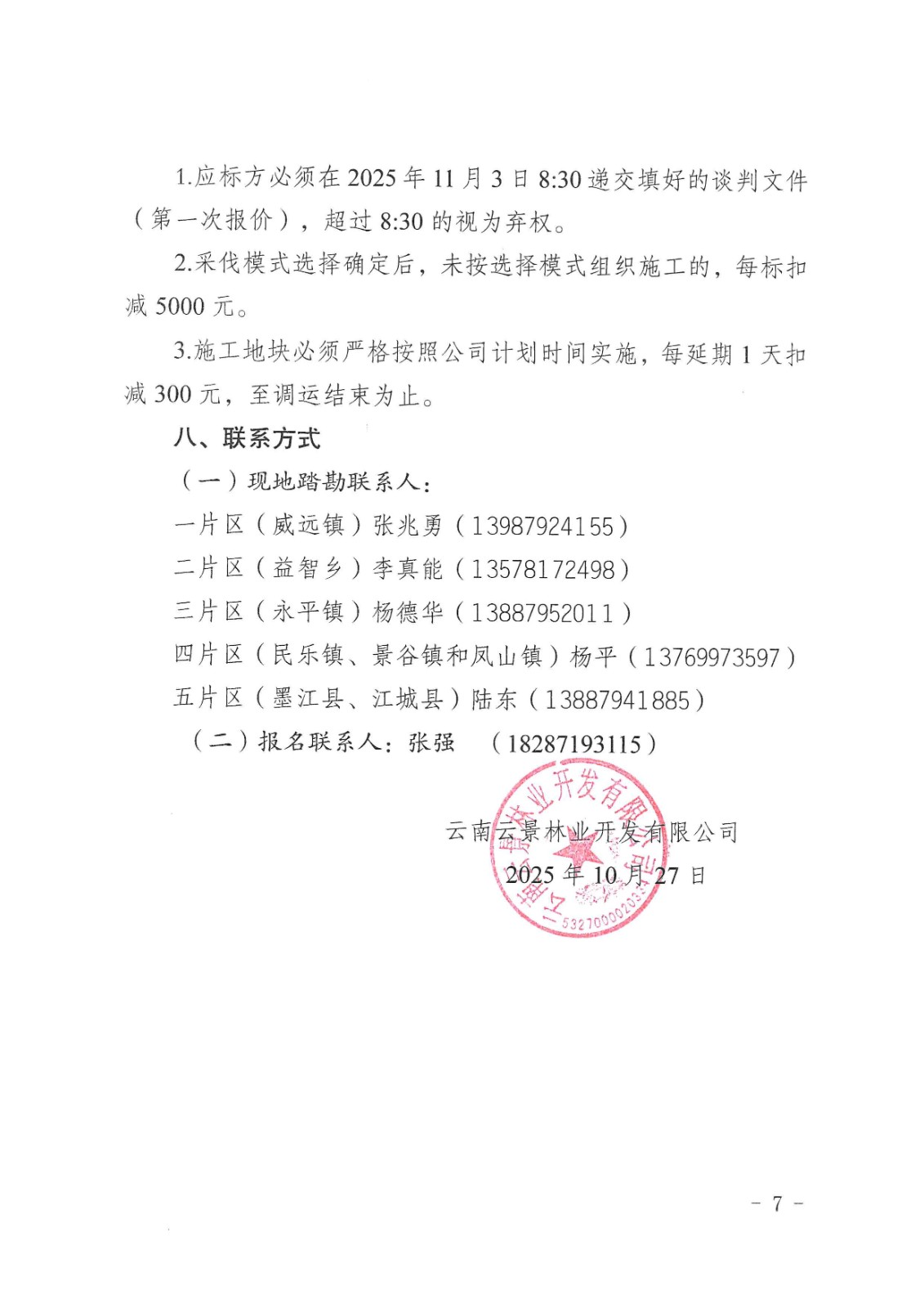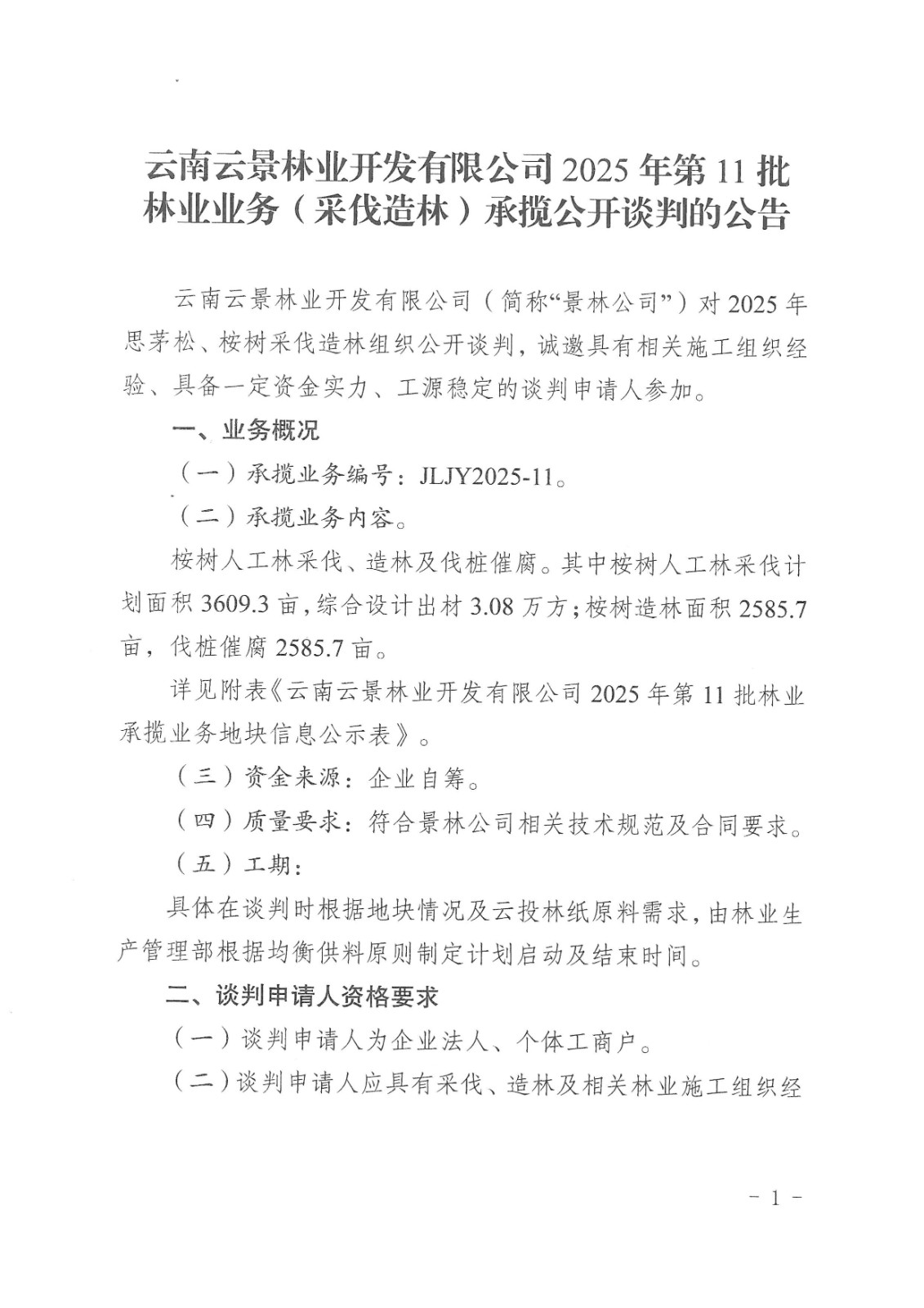 云南云景林業(yè)開發(fā)有限公司2025年第11批林業(yè)業(yè)務(wù)(采伐造林)承攬公開談判的公告