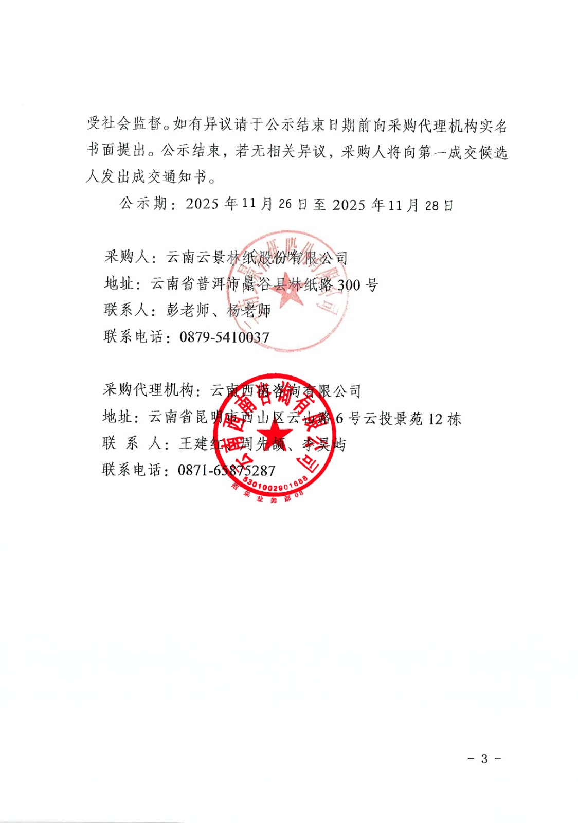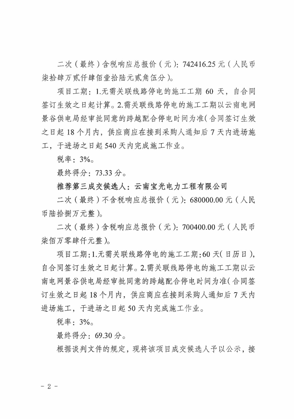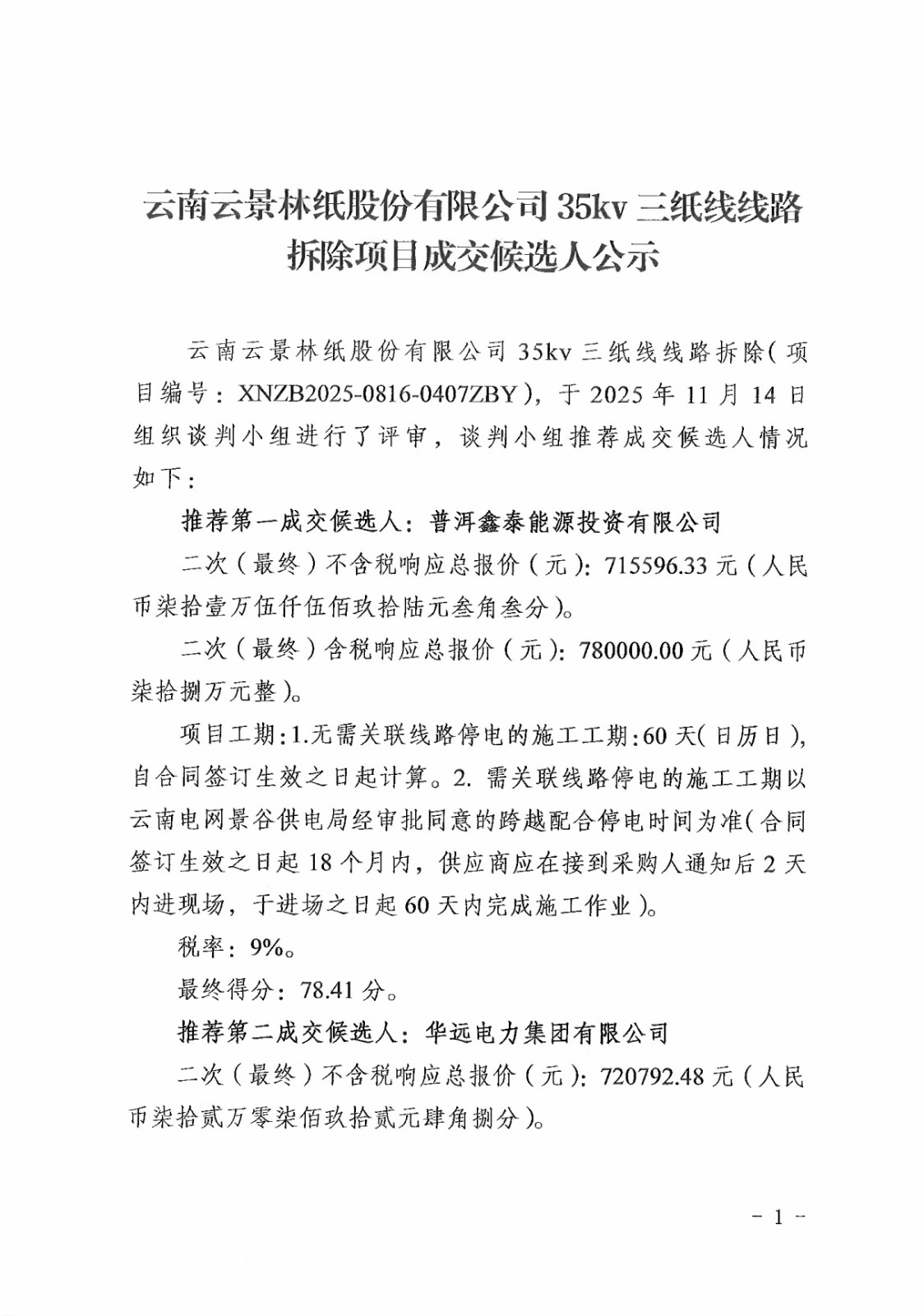 云南云景林紙股份有限公司35kv三紙線線路拆除項目成交候選人公示
