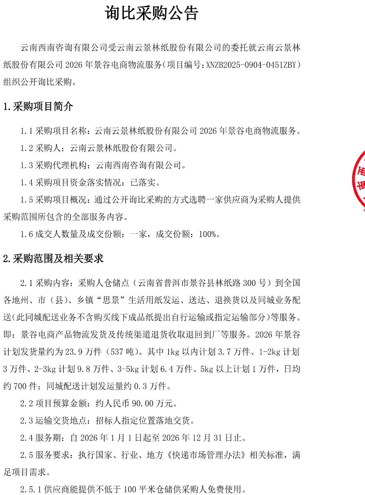 云南云景林紙股份有限公司雙氧水合格供應(yīng)服務(wù)商入圍采購(gòu)項(xiàng)目談判采購(gòu)公告