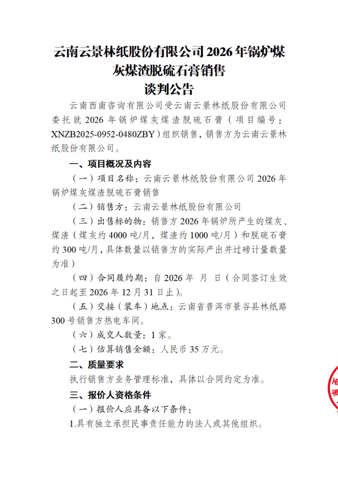 云南云景林紙股份有限公司2026年鍋爐煤灰煤渣脫硫石膏銷售談判公告
