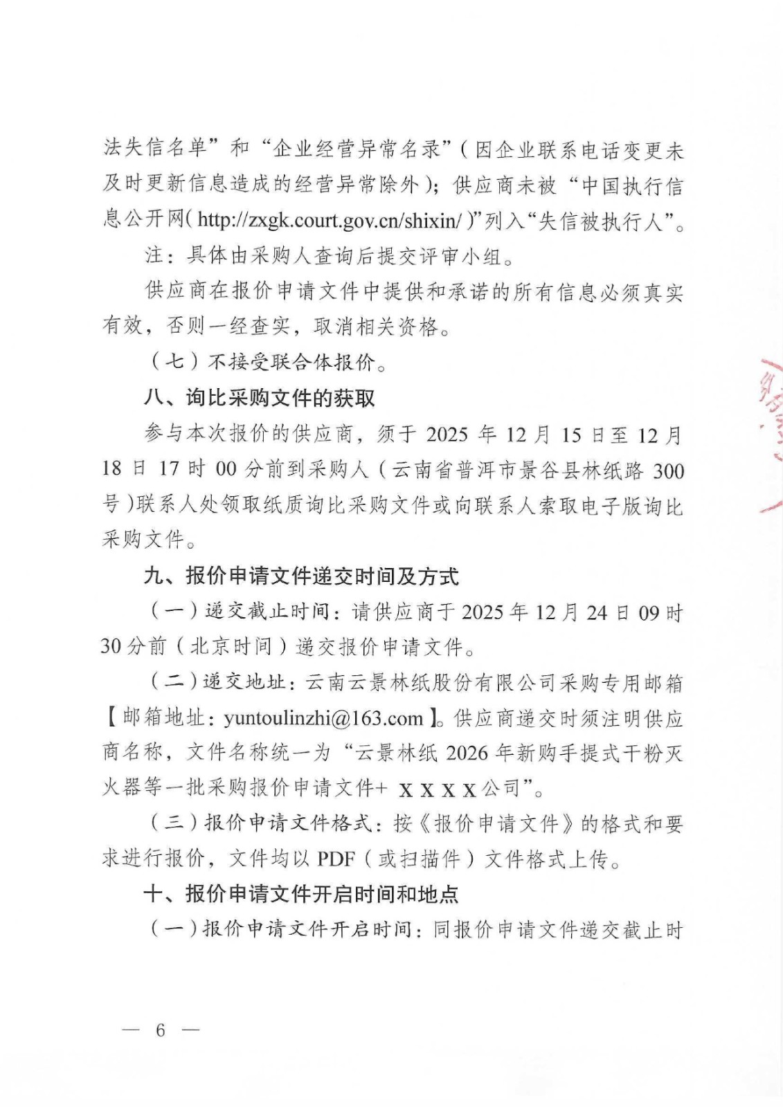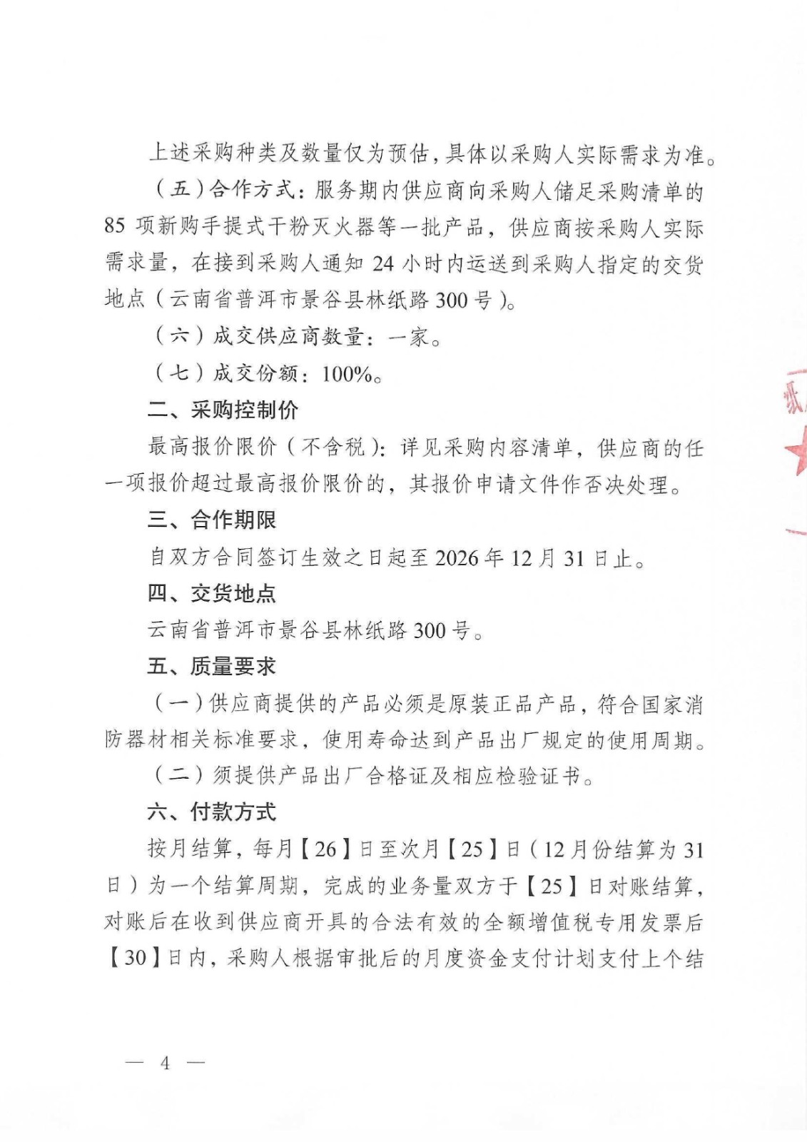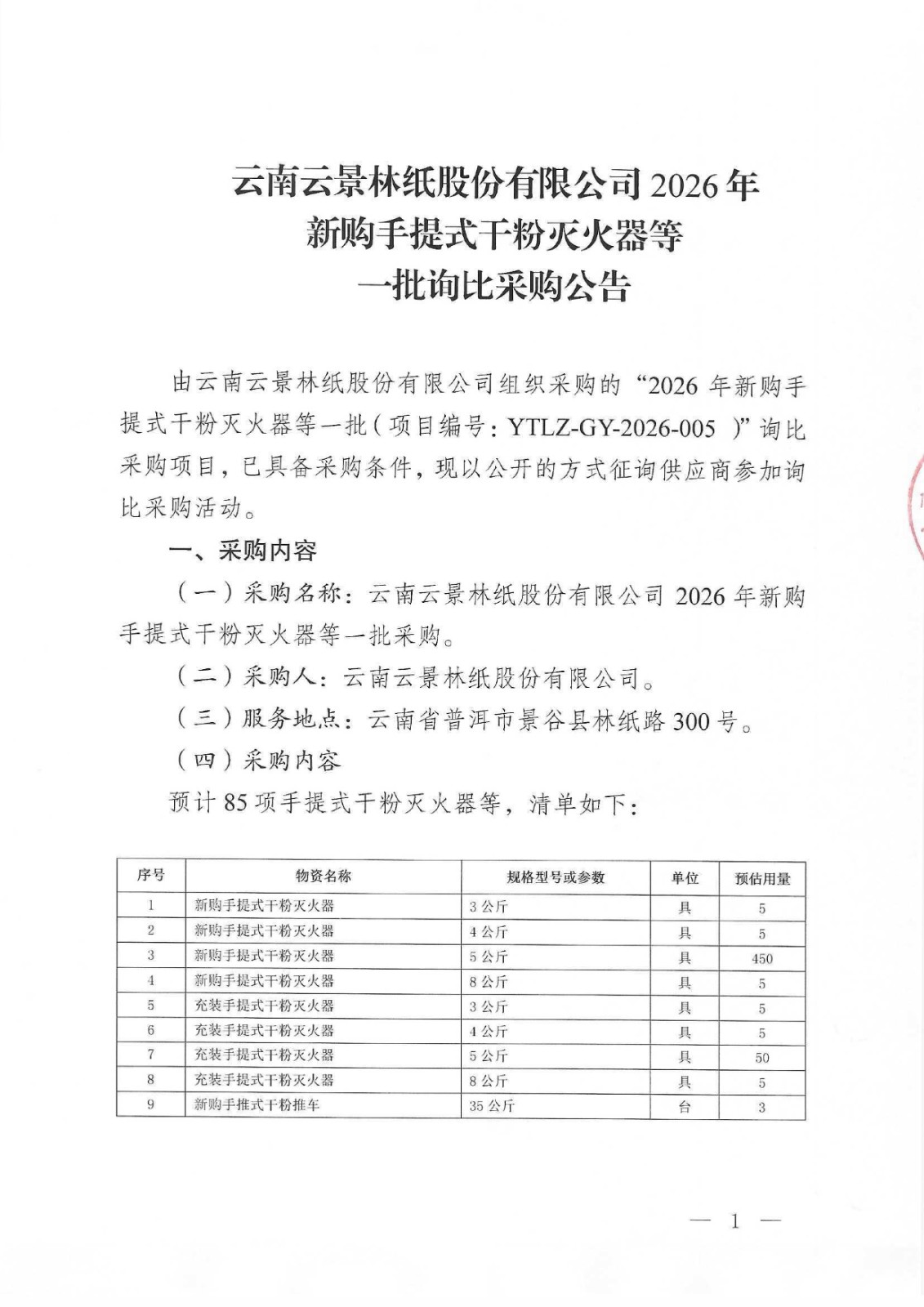 云南云景林紙股份有限公司2026年新購手提式干粉滅火器等一批詢比采購公告