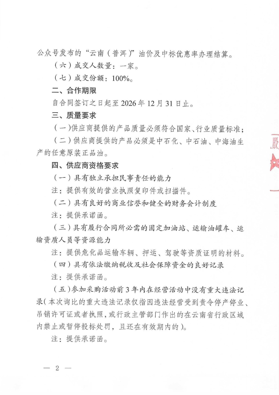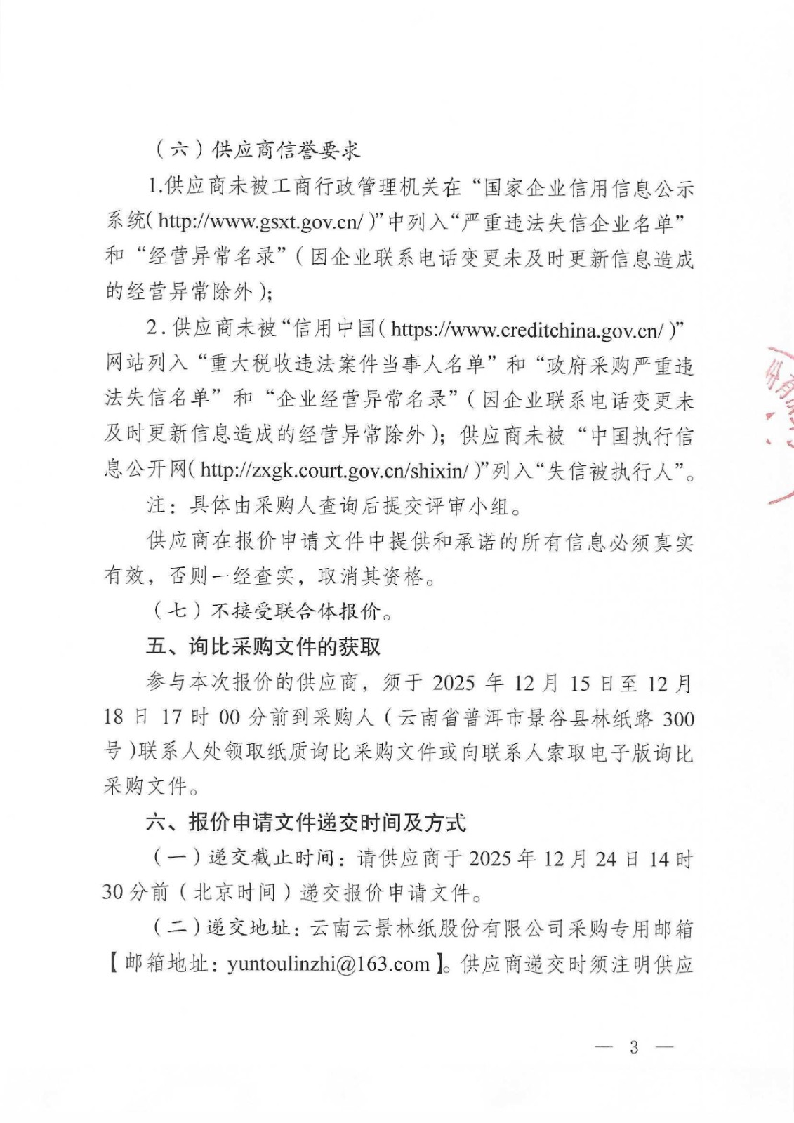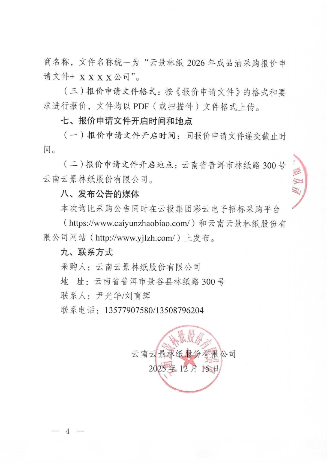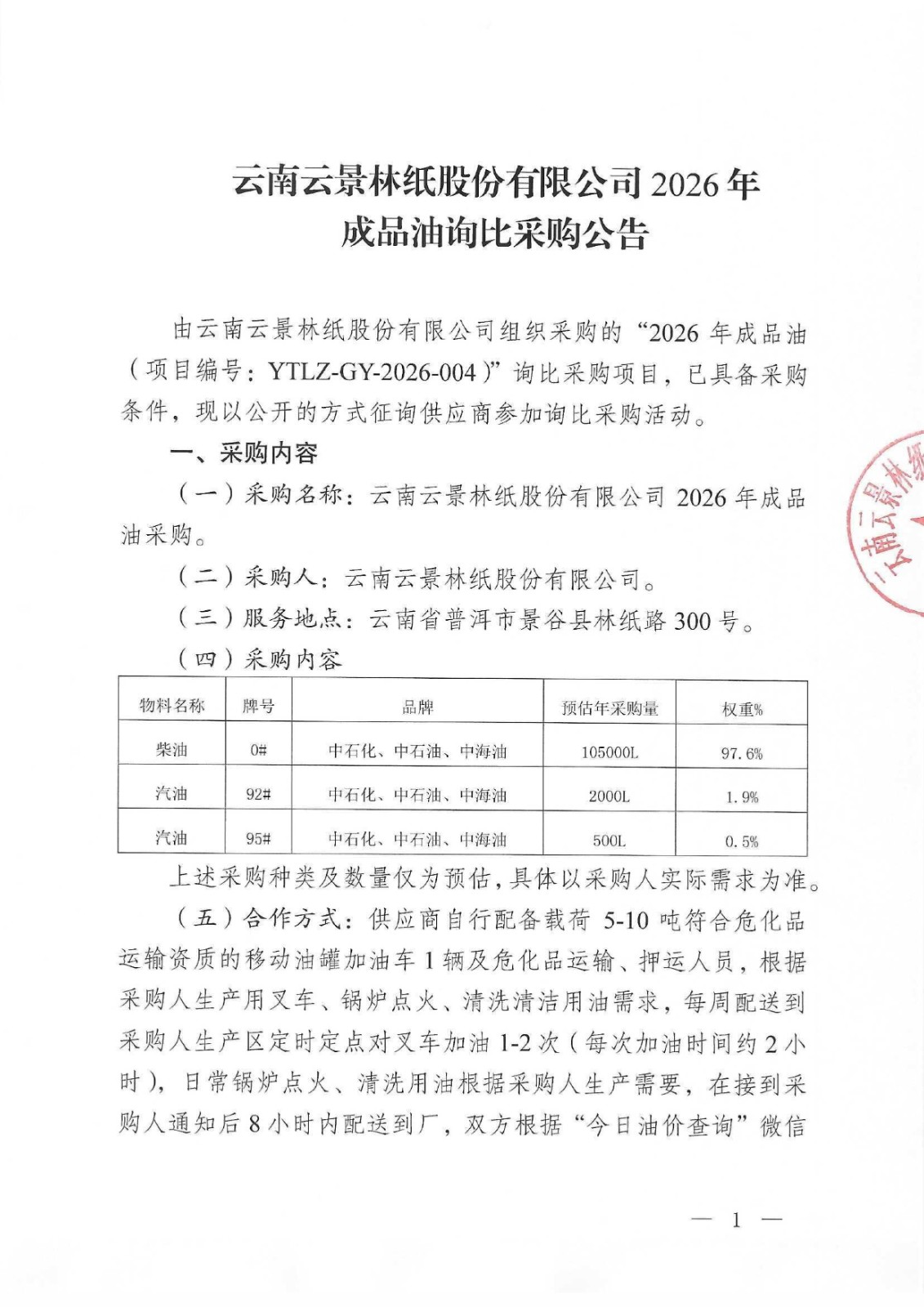 云南云景林紙股份有限公司2026年成品油詢比采購(gòu)公告