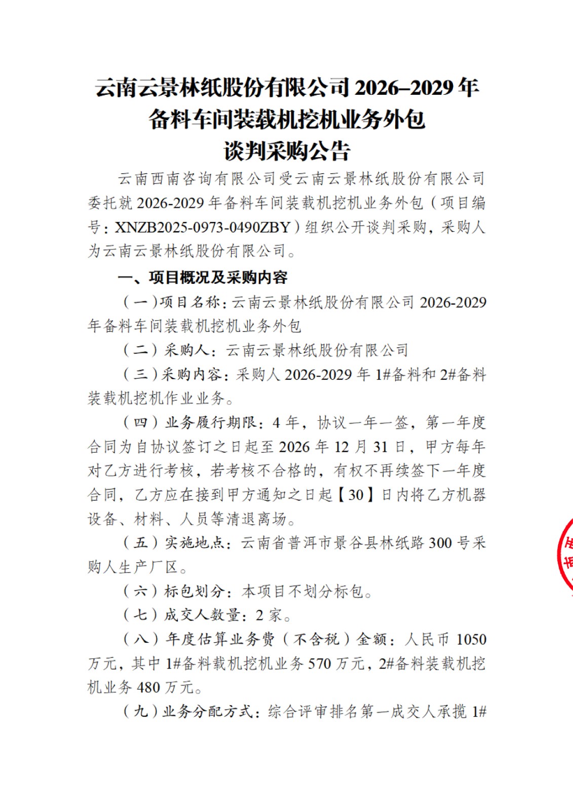 云南云景林紙股份有限公司2026-2029年備料車間裝載機(jī)挖機(jī)業(yè)務(wù)外包談判采購(gòu)公告