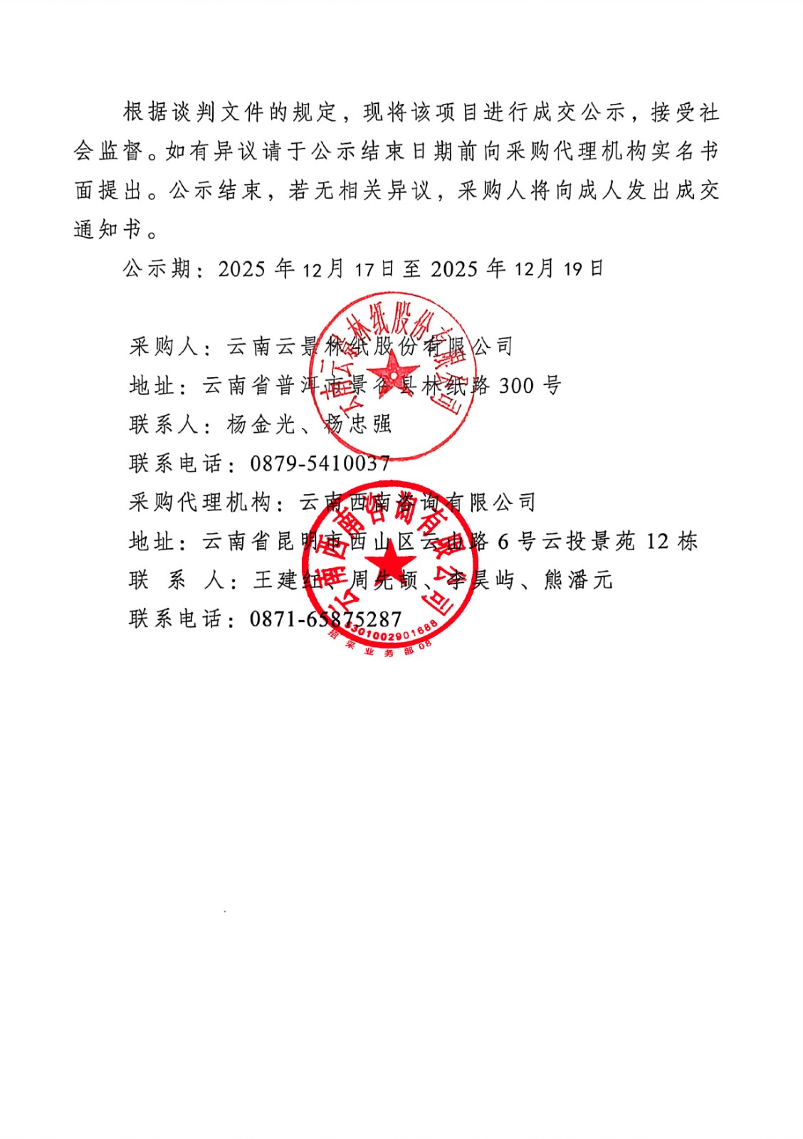 云南云景林紙股份有限公司2026年儀器儀表檢定校驗(yàn)業(yè)務(wù)外包成交公示