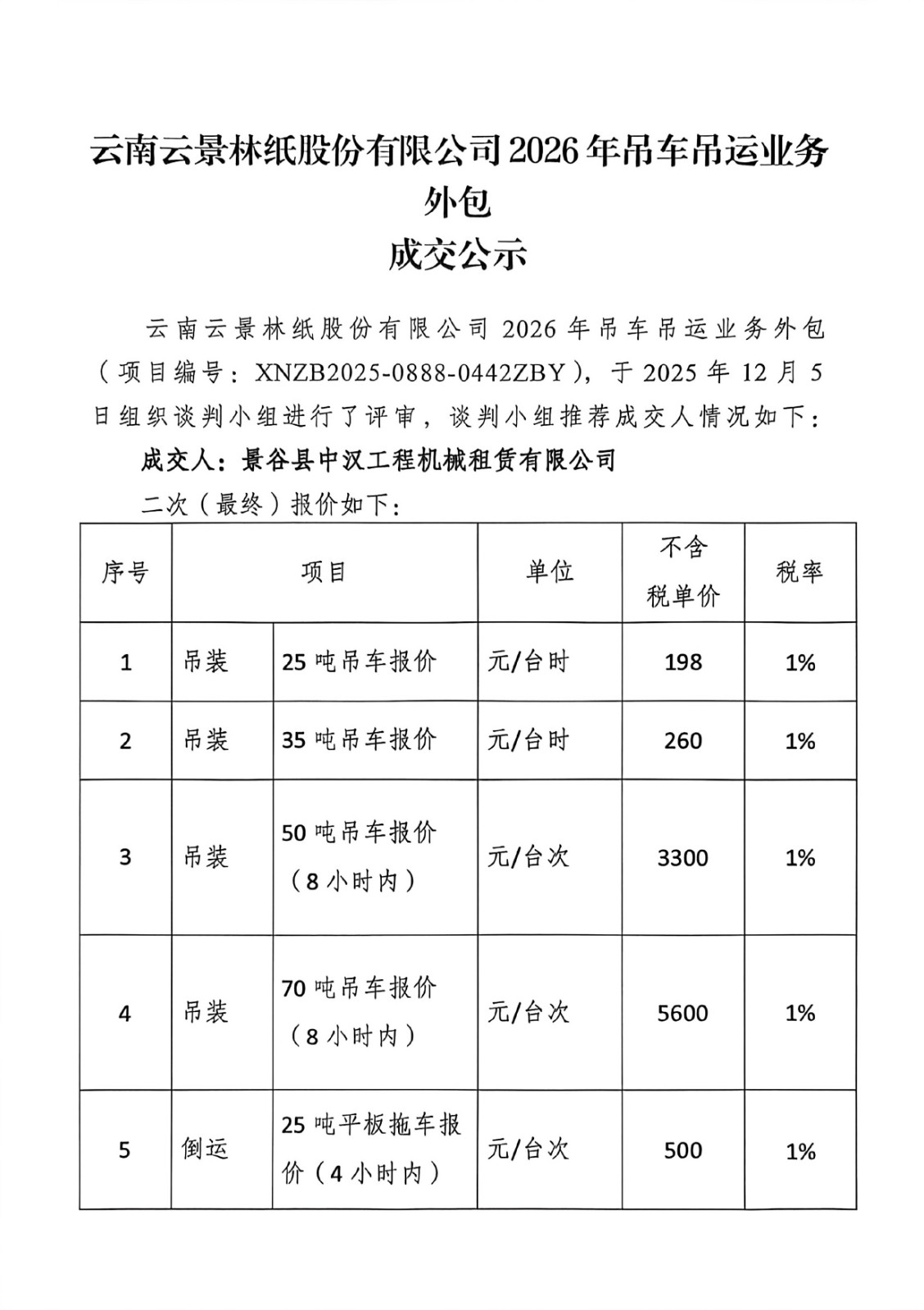 云南云景林紙股份有限公司2026年吊車(chē)吊運(yùn)業(yè)務(wù)外包成交公示