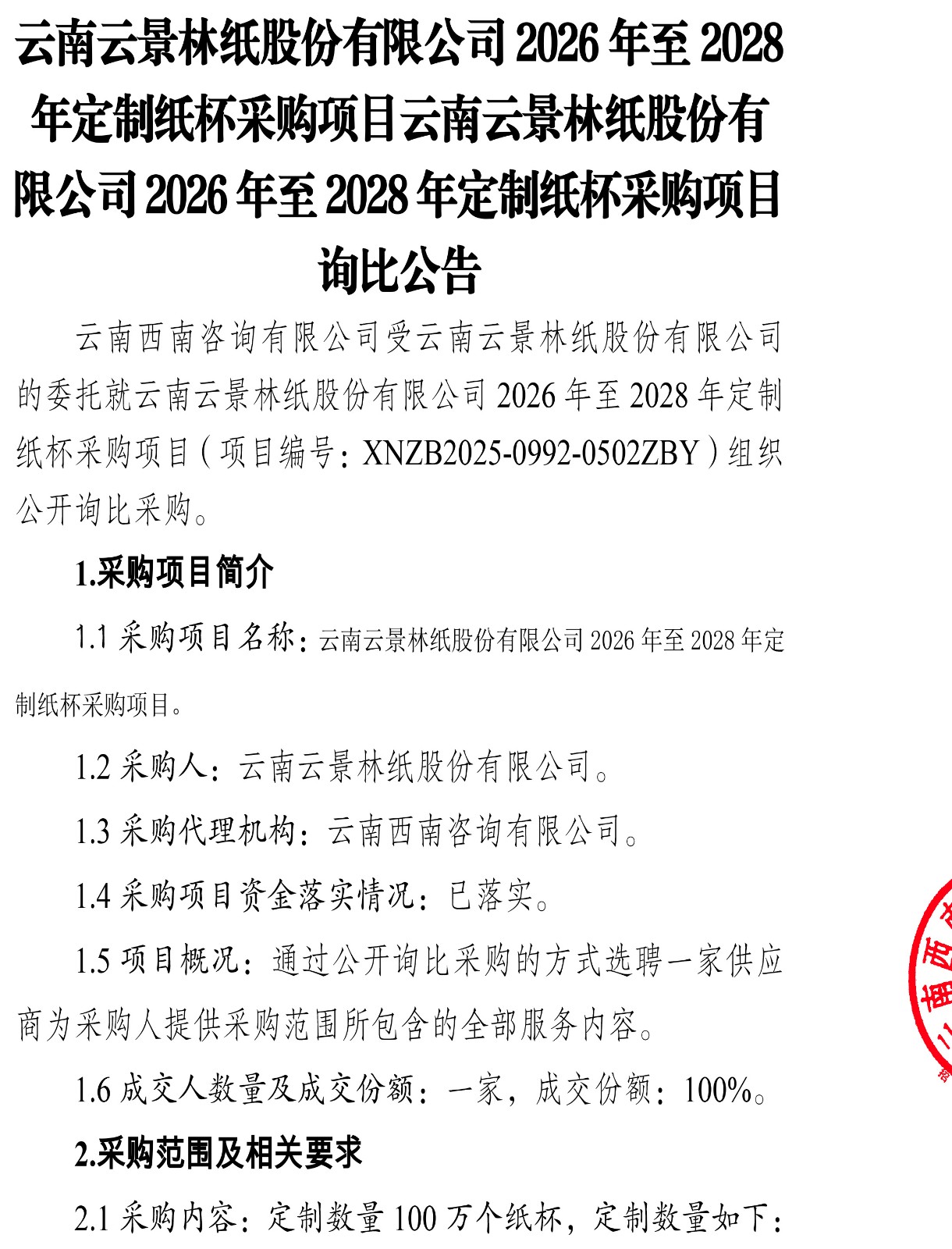 云南云景林紙股份有限公司2026年至2028年定制紙杯采購(gòu)項(xiàng)目云南云景林紙股份有限公司2026年至2028年定制紙杯采購(gòu)項(xiàng)目詢比公告