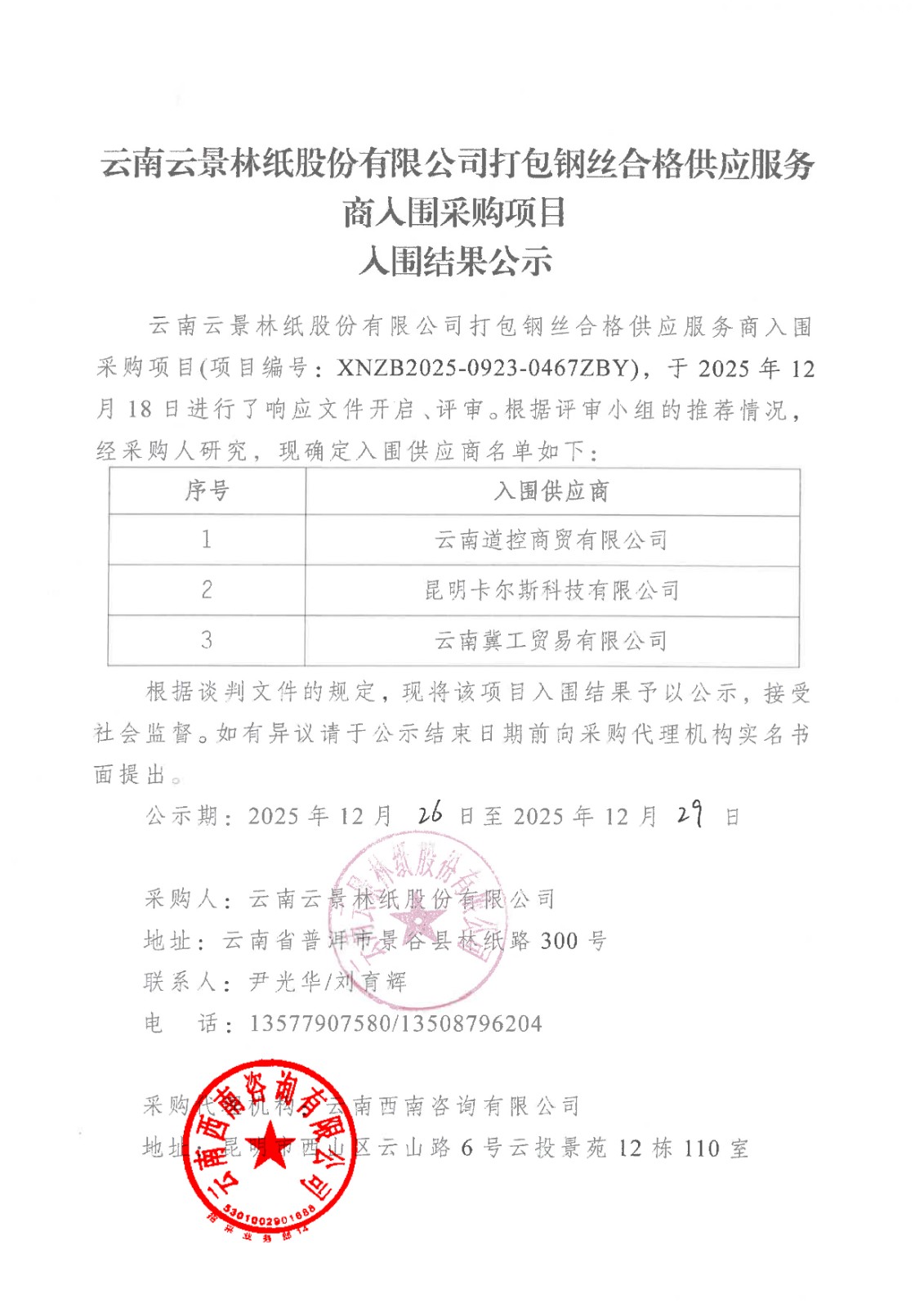 云南云景林紙股份有限公司打包鋼絲合格供應(yīng)服務(wù)商人圍采購項(xiàng)目入圍結(jié)果公示