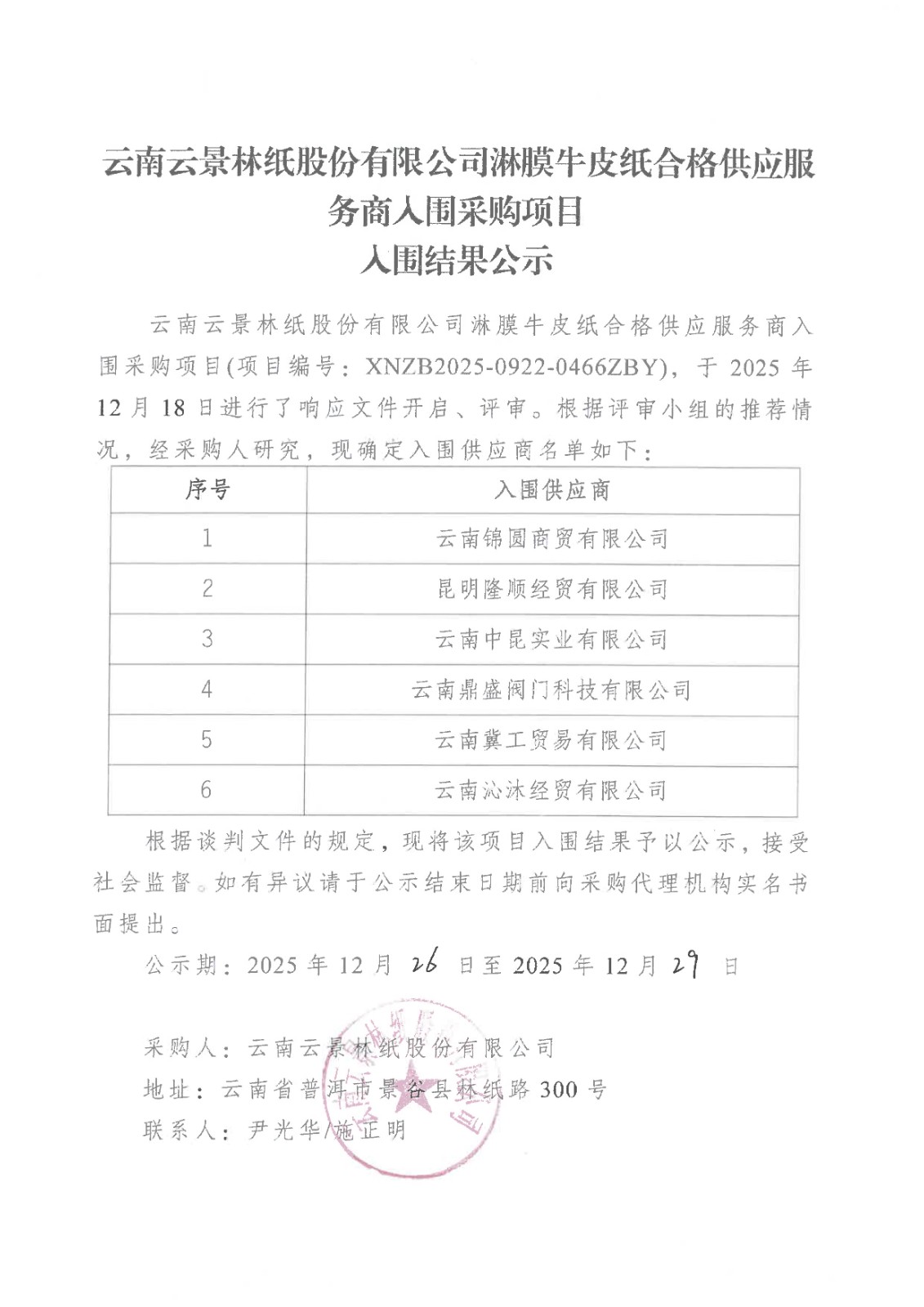 云南云景林紙股份有限公司零星化工原料合格供應服務商入圍采購項目入圍結(jié)果公示