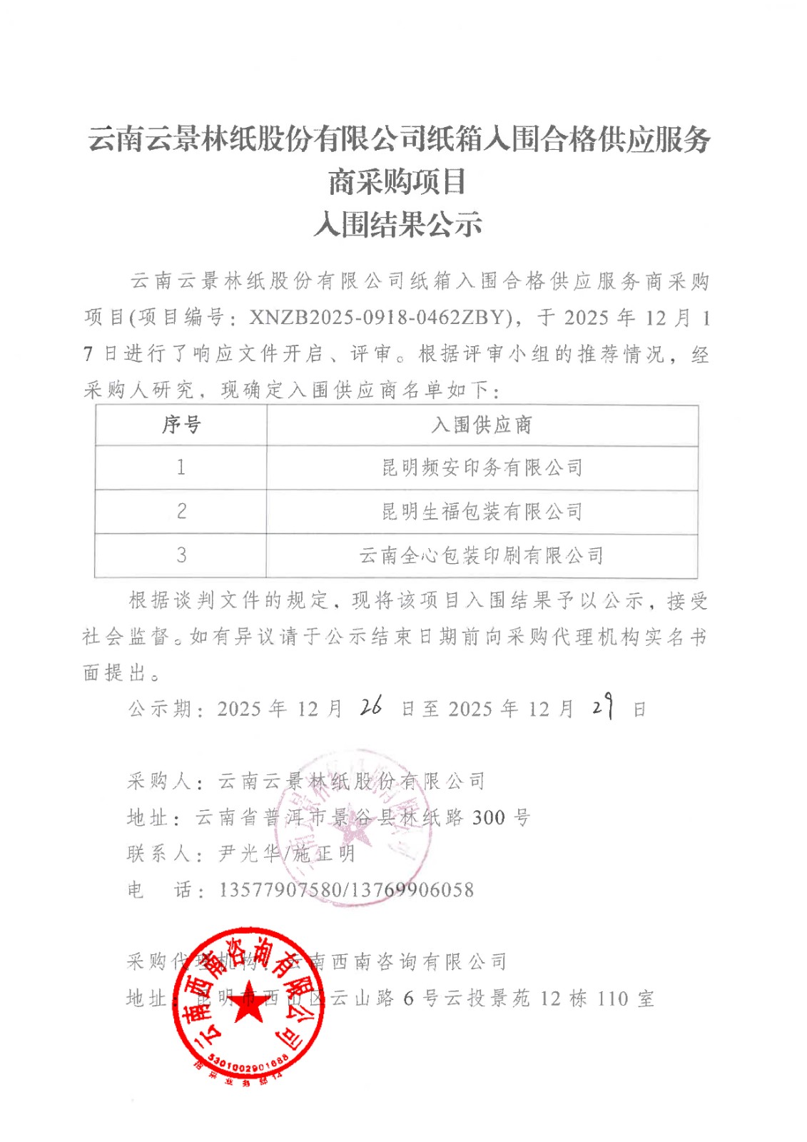 云南云景林紙股份有限公司紙箱入圍合格供應(yīng)服務(wù)商采購(gòu)項(xiàng)目入圍結(jié)果公示