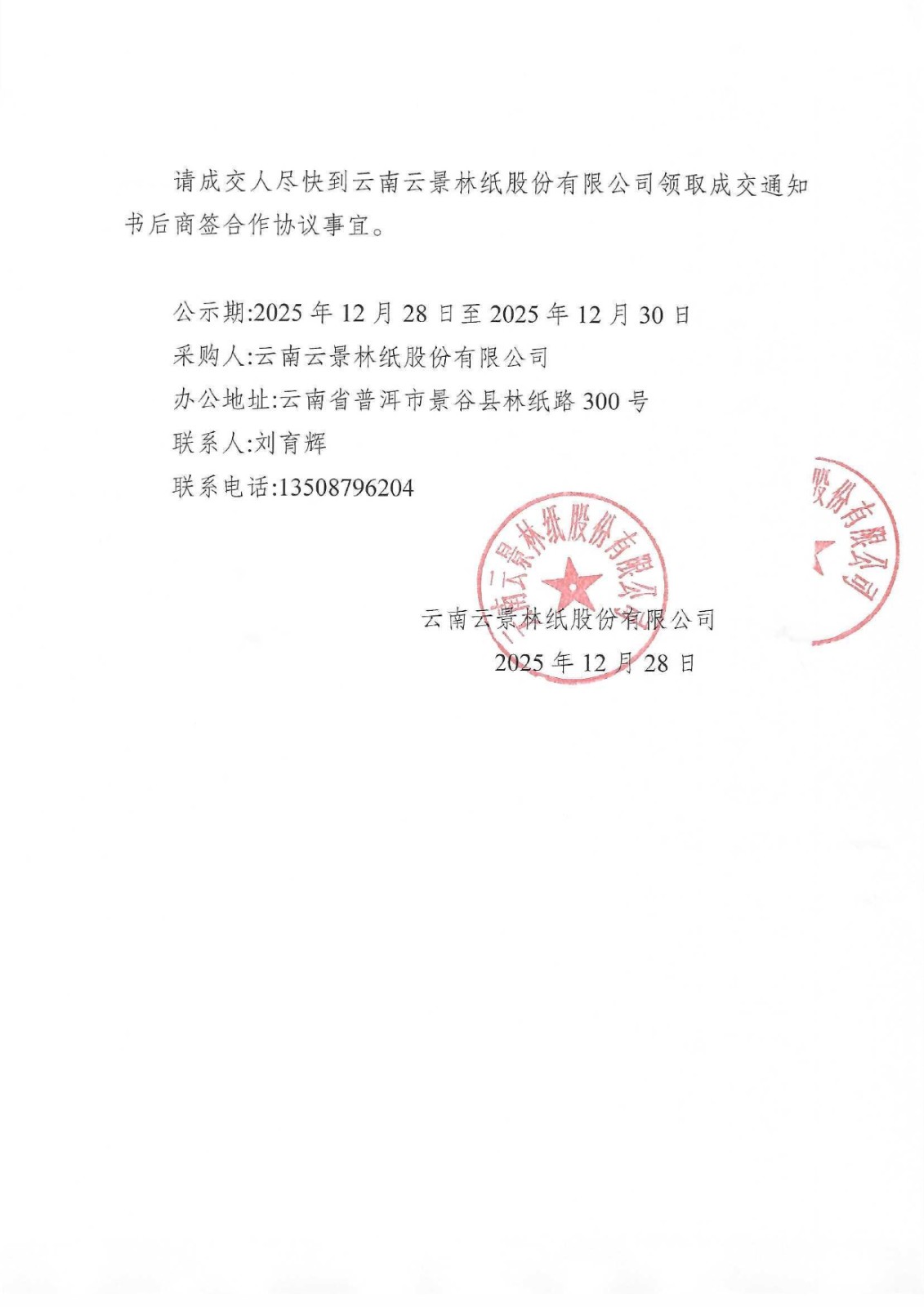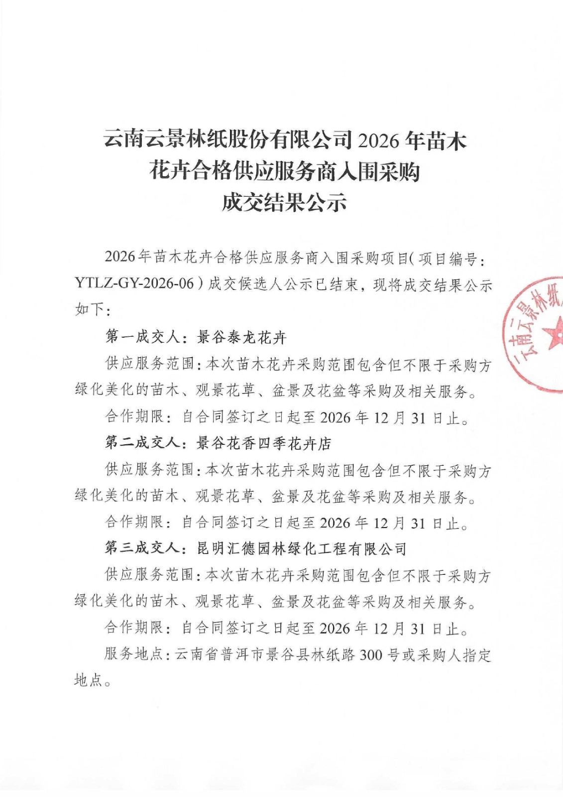 云南云景林紙股份有限公司2026年苗木花卉合格供應(yīng)服務(wù)商人圍采購(gòu)成交結(jié)果公示