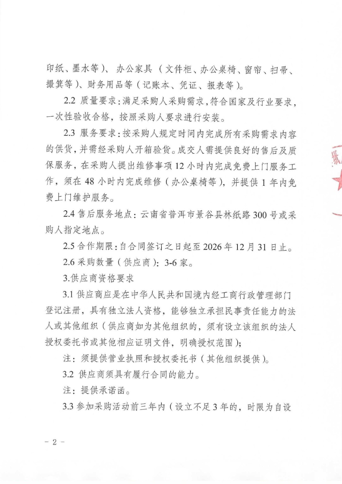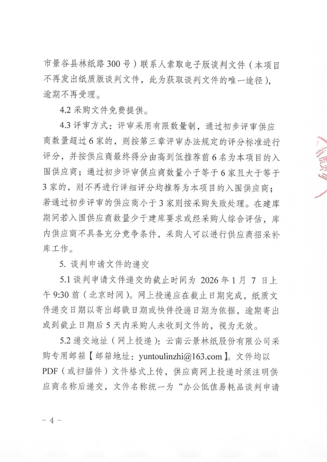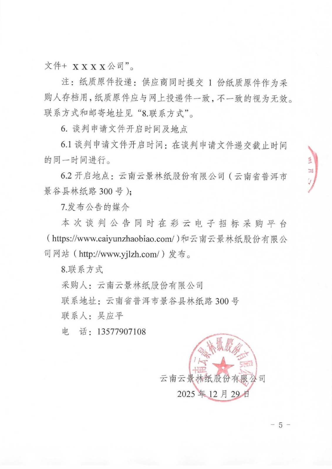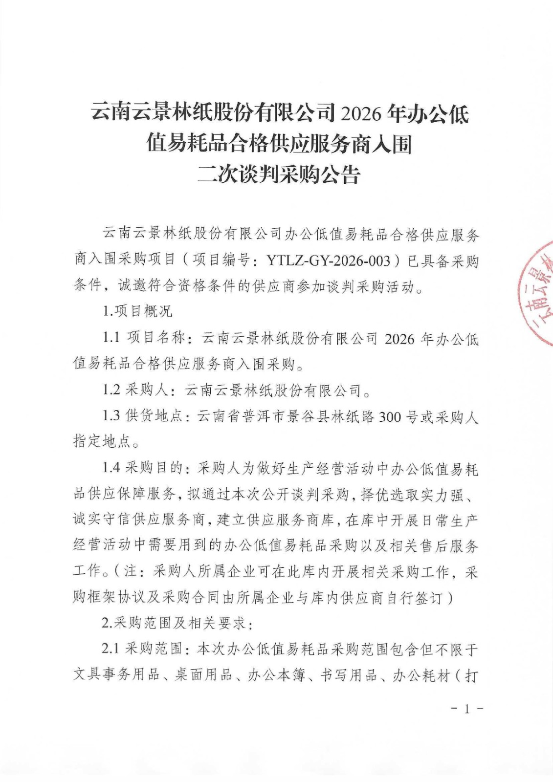 云南云景林紙股份有限公司2026年辦公低值易耗品合格供應(yīng)服務(wù)商人圍二次談判采購公告