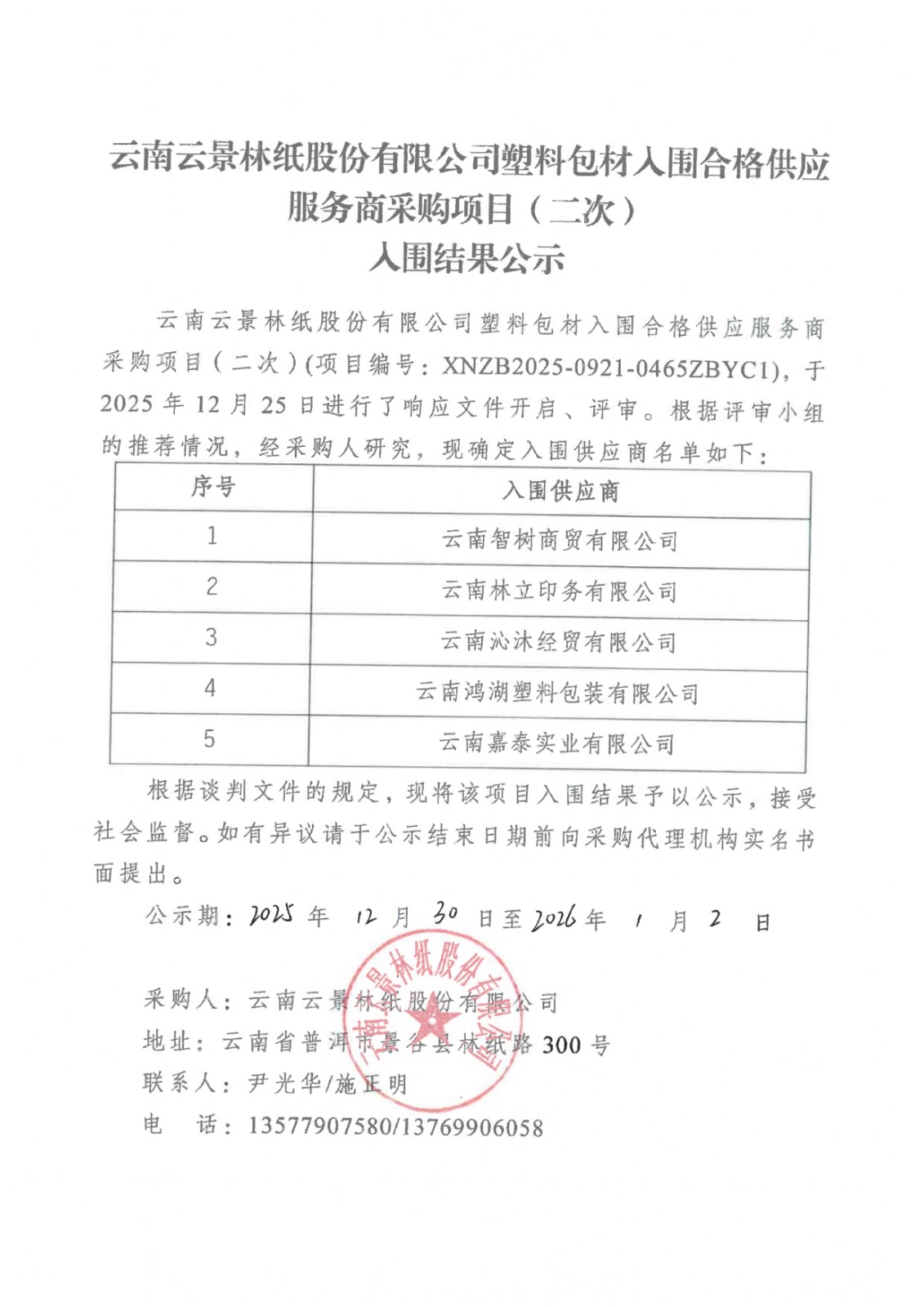 云南云景林紙股份有限公司塑料包材人圍合格供應(yīng)服務(wù)商采購項目(二次)人圍結(jié)果公示