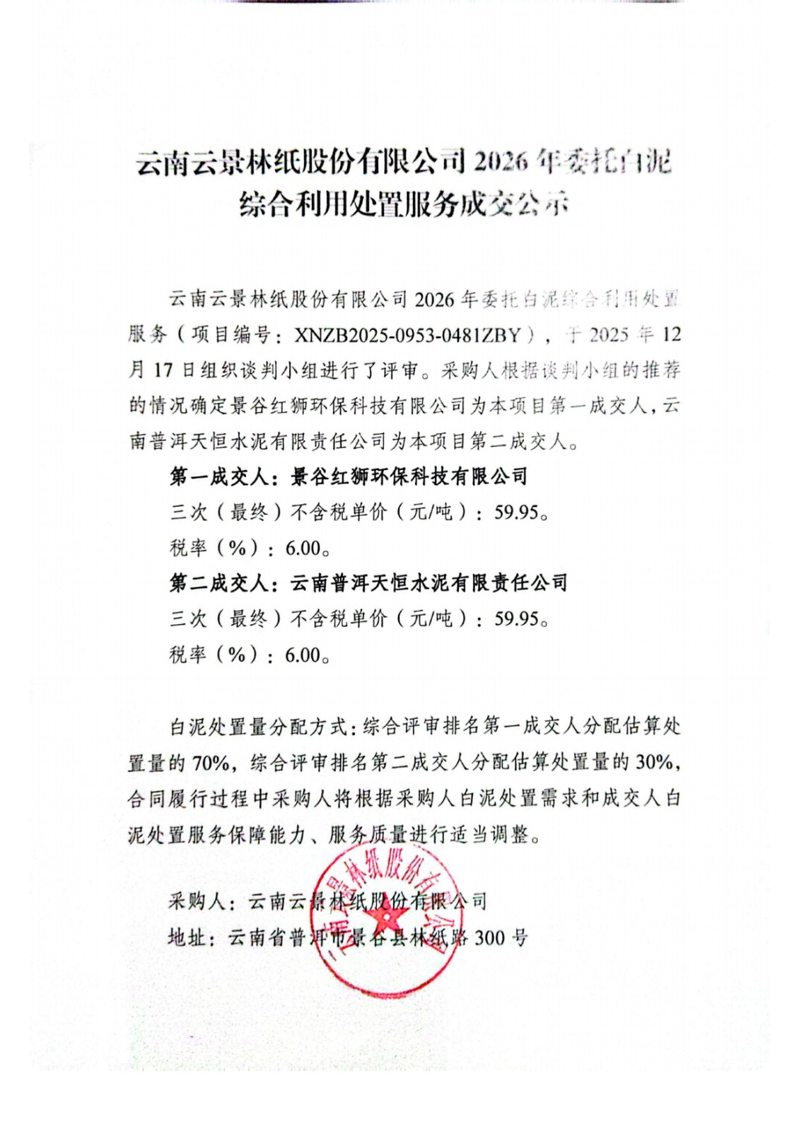 云南云景林紙股份有限公司2026年委托白泥綜合利用處置服務(wù)成交公示