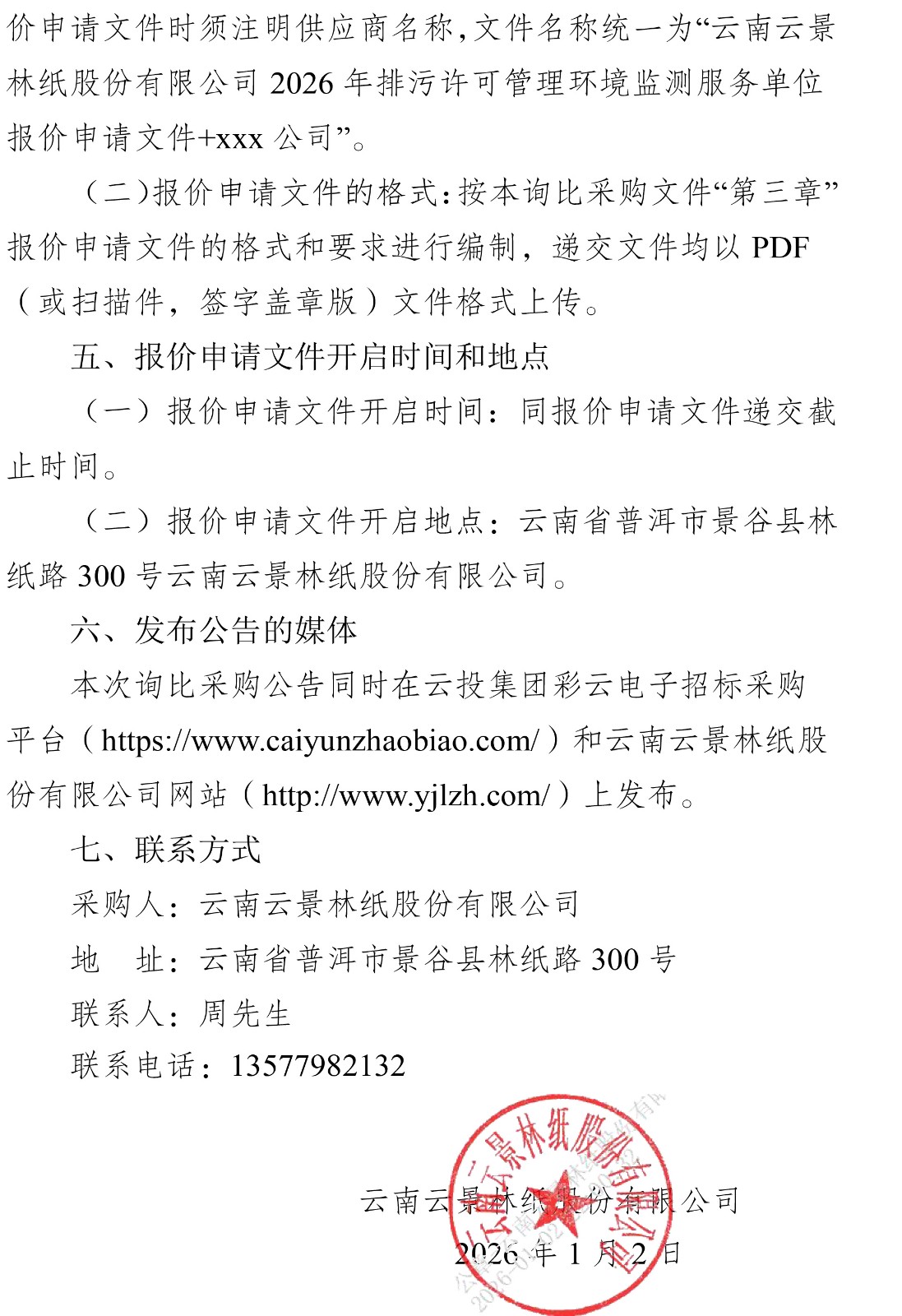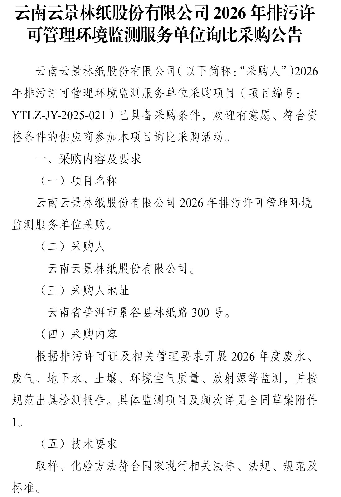 云南云景林紙股份有限公司2026年排污許可管理環(huán)境監(jiān)測服務(wù)單位詢比采購公告